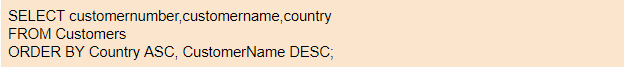 The following SQL statement selects all customers from the “Customers” table, sorted ascending by the “Country” and descending by the “CustomerName” column: