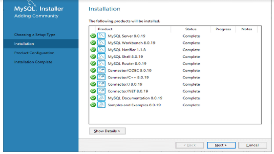 In the next screen, you can see that the Product Configuration is completed. Keep the default setting and click on the Next button to complete the MySQL package installation.