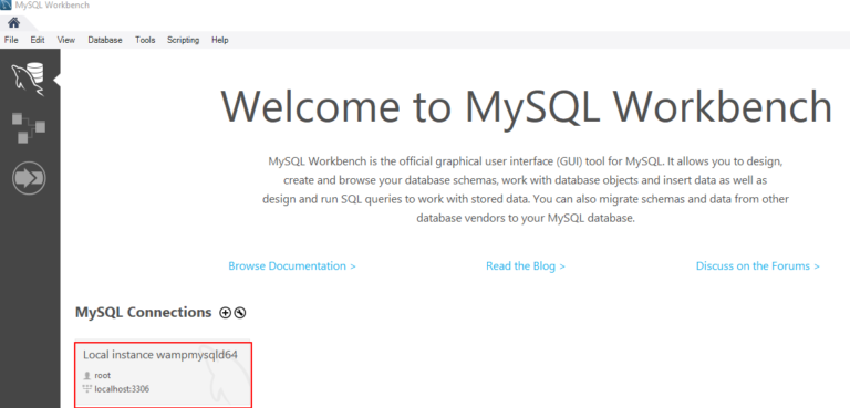 Now click the local instance bar at bottom-left of the page and type-in your Root Password (The password you created whilst installing the MySQL database)