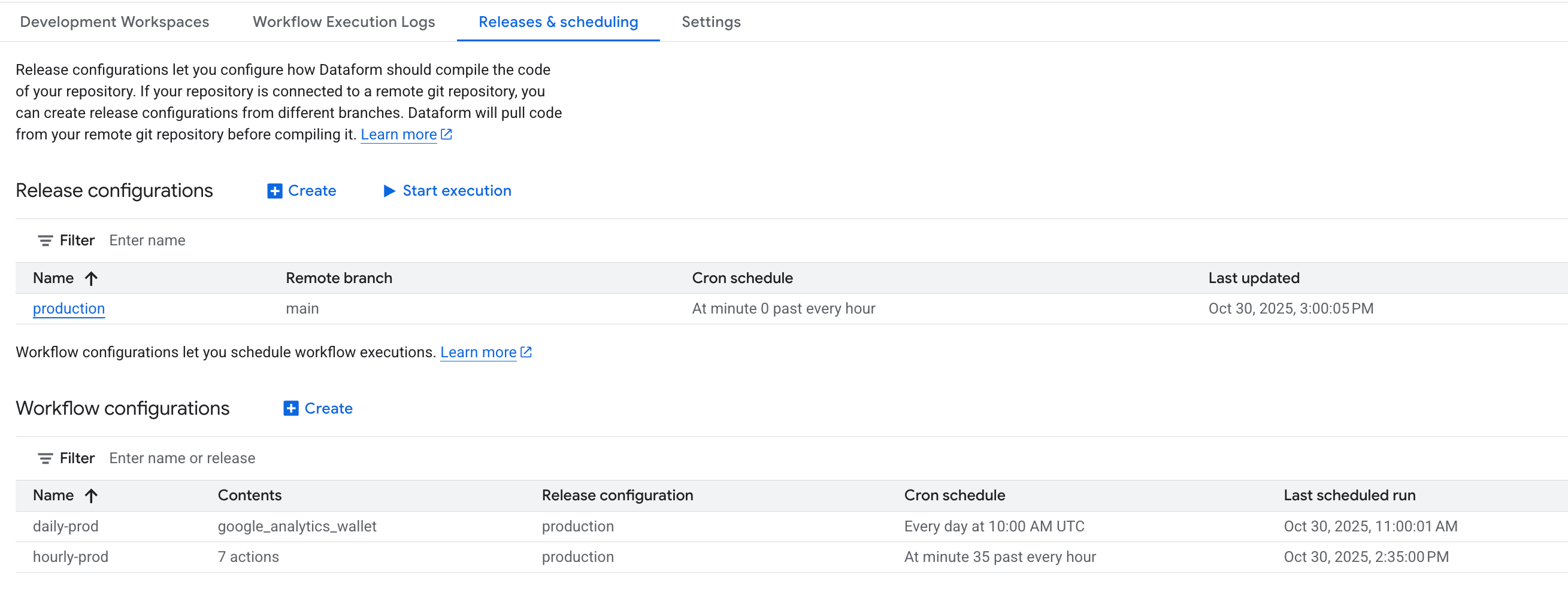 After connecting your remote Git repository using a provider like GitHub, the final bit is to set workflow runs within the "Releases & scheduling" section in your Dataform repository. Dataform will pull code from your remote git repository before compiling it. This is the "release configuration" aspect — a snapshot of the latest version of your codes. You can then set workflow runs, essentially CRON jobs, for selected production tables and at different frequencies.