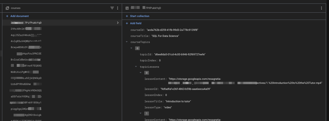 [Snapshot from a Firestore collection containing multiple documents. This is similar to a relational database storing multiple tables.]
