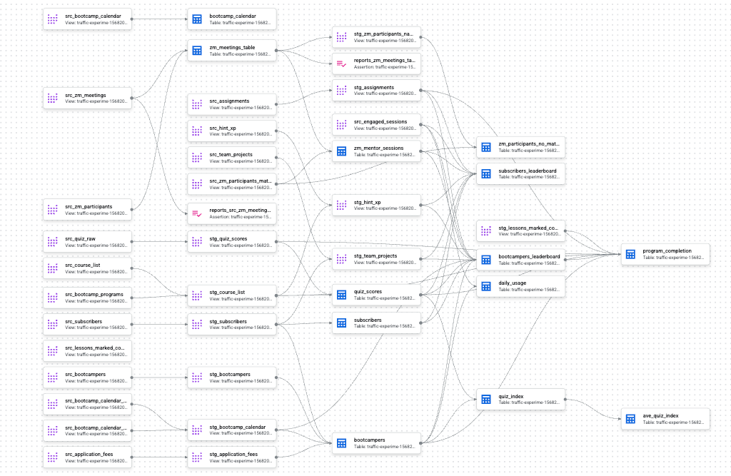 In this compiled graph, data flows from the left hand side to the right hand side with the final production tables at the far right and materialised as tables in BigQuery. You can also see some assertions created on certain tables.