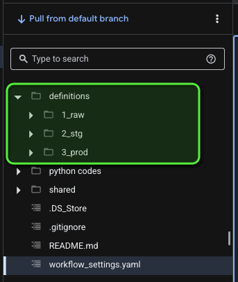 In the definitions folder, I create raw, staging, and production folders. These are important to maintain a logical and segmented flow of your data pipeline.