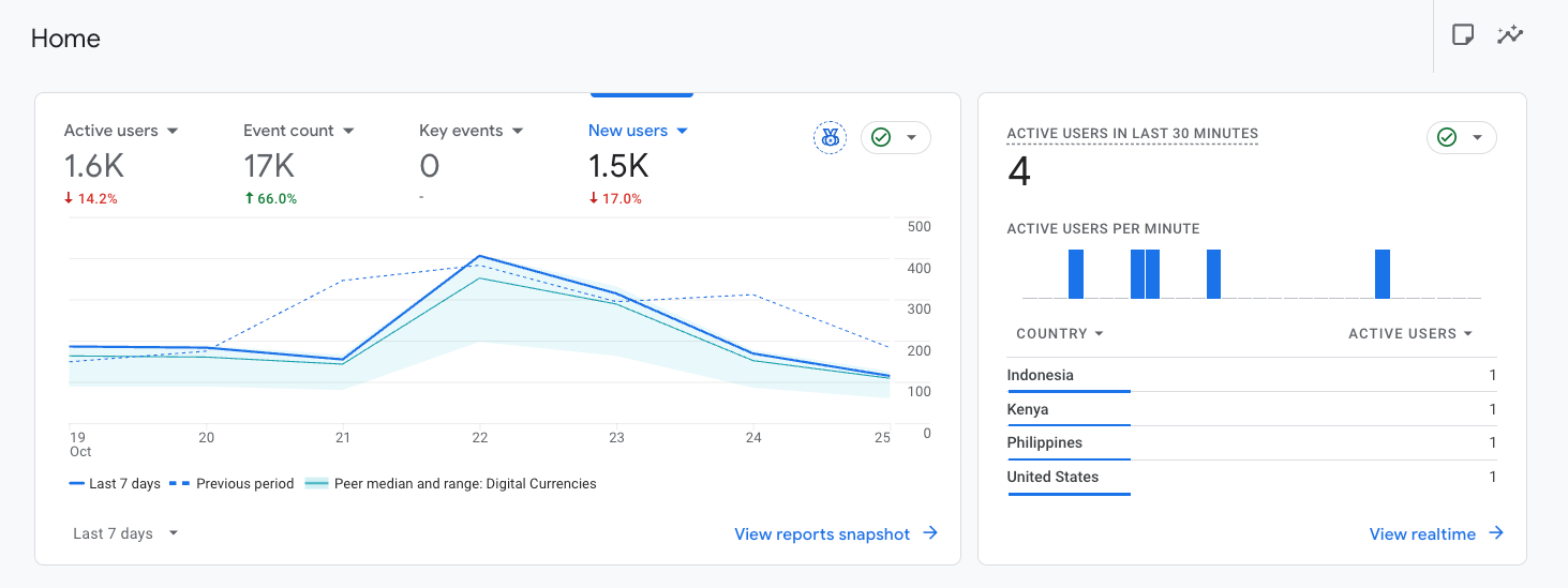 [Snapshot from a Google Analytics home screen showing active users in the last 7 days and active users in the last 30 minutes (realtime)]