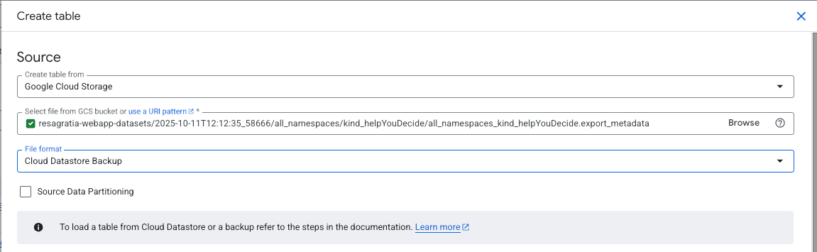 Then from the raw schema in BigQuery, I create a table using a Cloud Datastore backup as the input source.