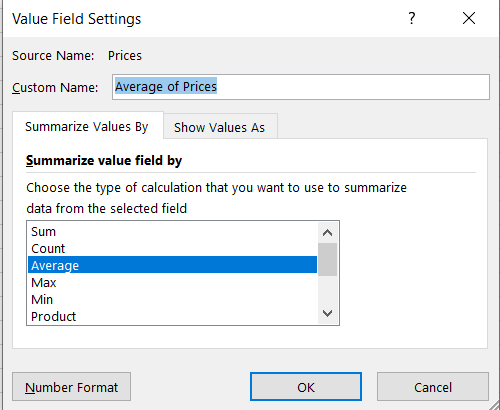 The prices aggregation is by default a count but we will be using the average of prices instead.