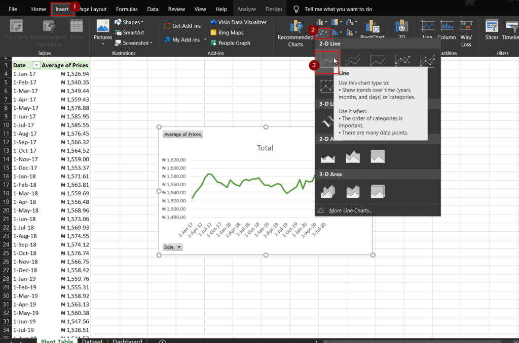 To insert a line chart, follow these steps: