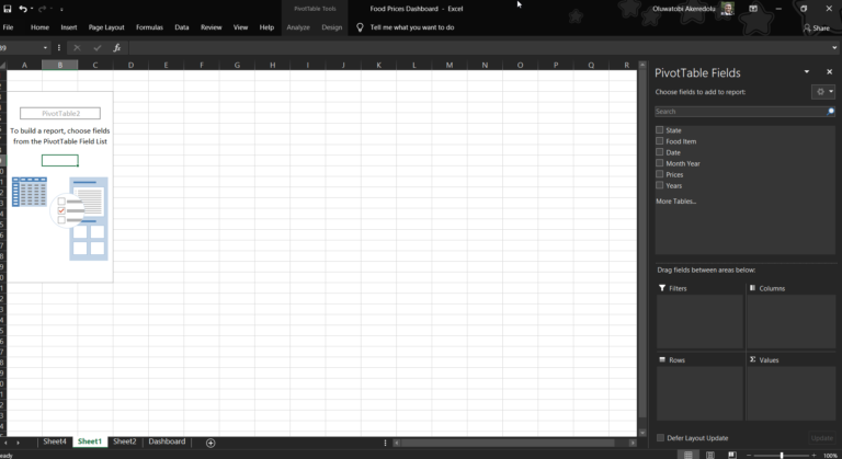 Clicking on the Ok button will create a Pivot Table cache and Pivot Table fields panel in a new sheet as shown in the diagram below: