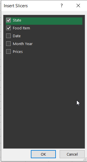 Insert slicers dialog box