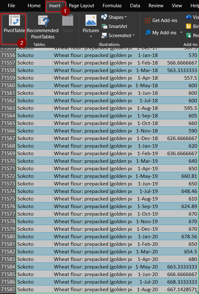 We will use Microsoft Excel tools such as power query and pivot table to clean and articulate the data. The video below details the techniques used to clean and transform the raw data of the selected food prices into a proper dataset that can be manipulated, explored, and visualized.