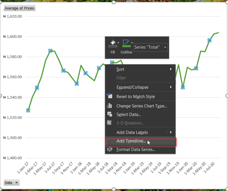To insert a moving average on the line chart for the selected food prices in Nigeria, follow these steps: