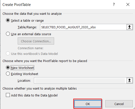 A Dialog box will appear. Select Ok for the Pivot Table to be created on a new sheet.