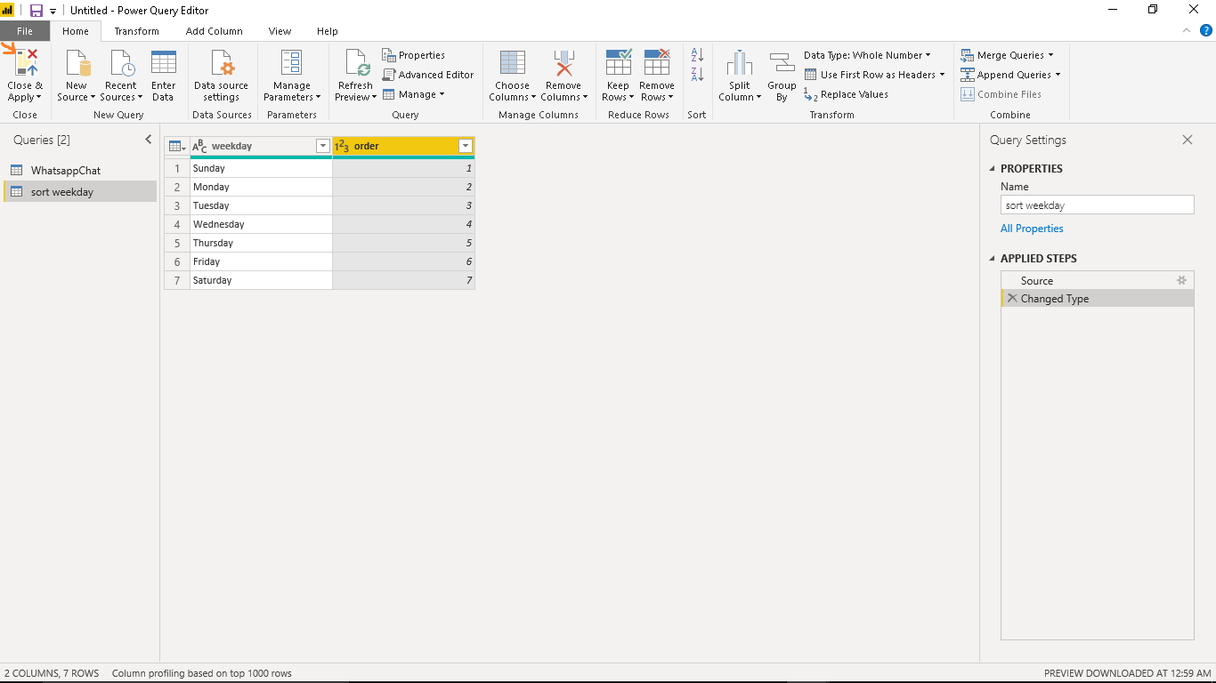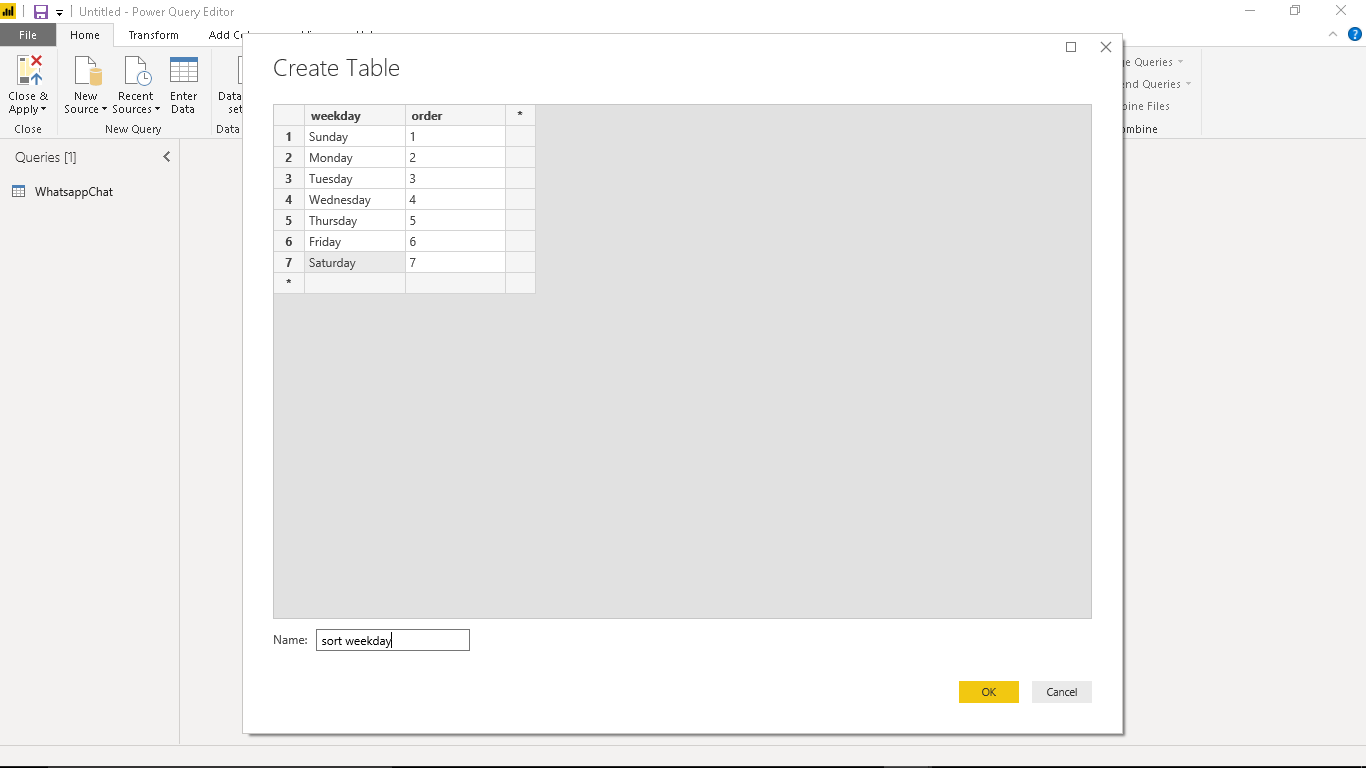 We now have two tables: WhatsappChat and sort weekday. Select Close & Apply.