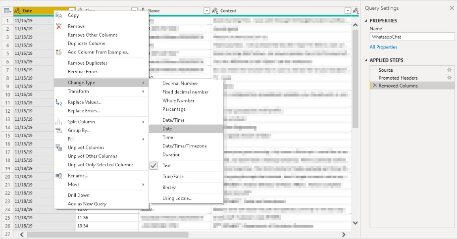 Next, we change the type for each column. Right-click on the Date column, click the Change Type option and select Date.