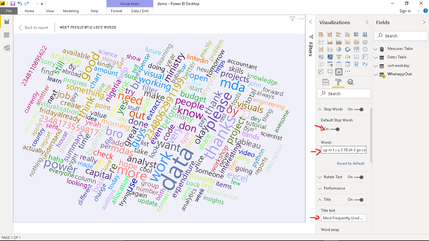 Now navigate to the Format pane and under Stopwords turn Default Stopwords On. In the Words tab, enter letters and words that are not informative and relevant (enter each letter/word followed by a space and then the next letter/word). Rename Title to Most Frequently Used Words.