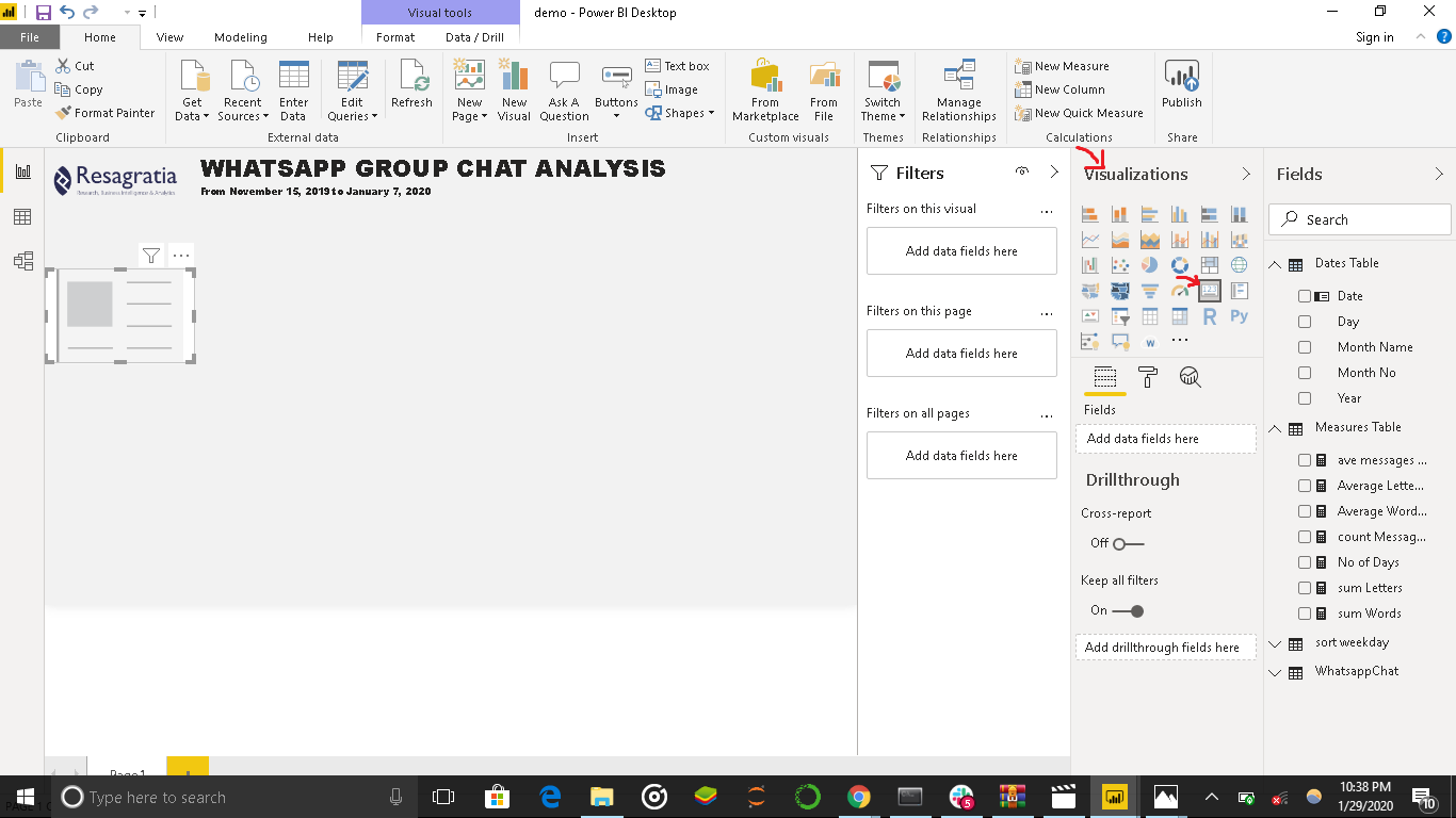 Next, we will create Card visuals showing Total Active Members, No of Days, Total Messages, Total Words, and Total Letters.