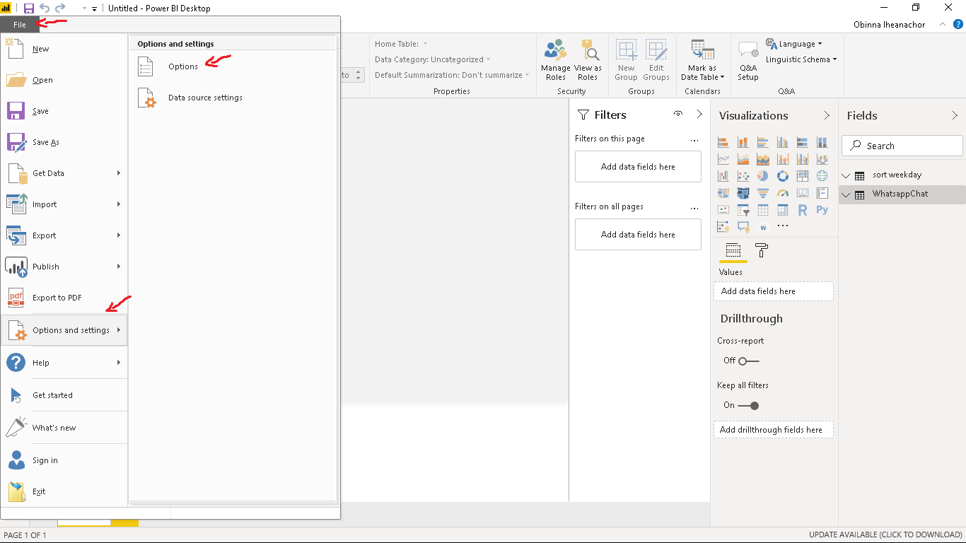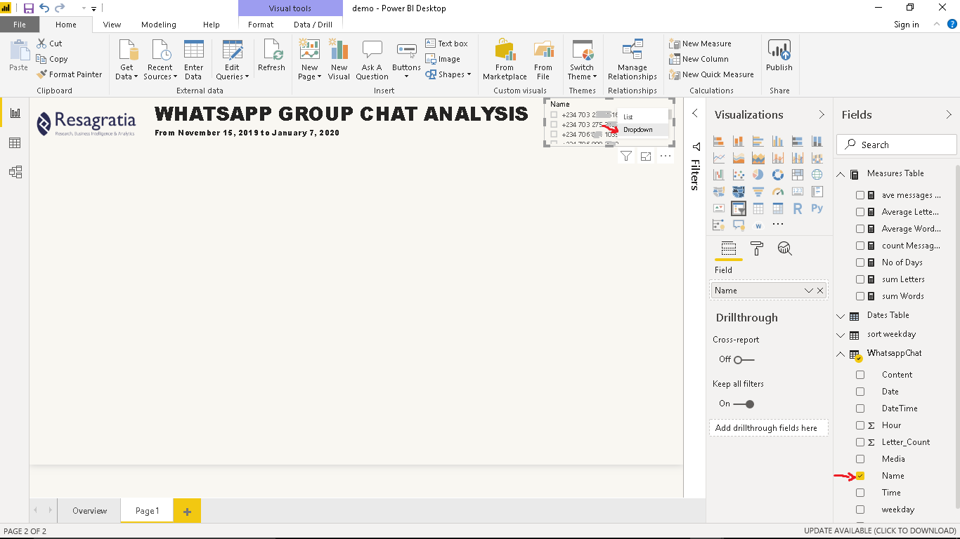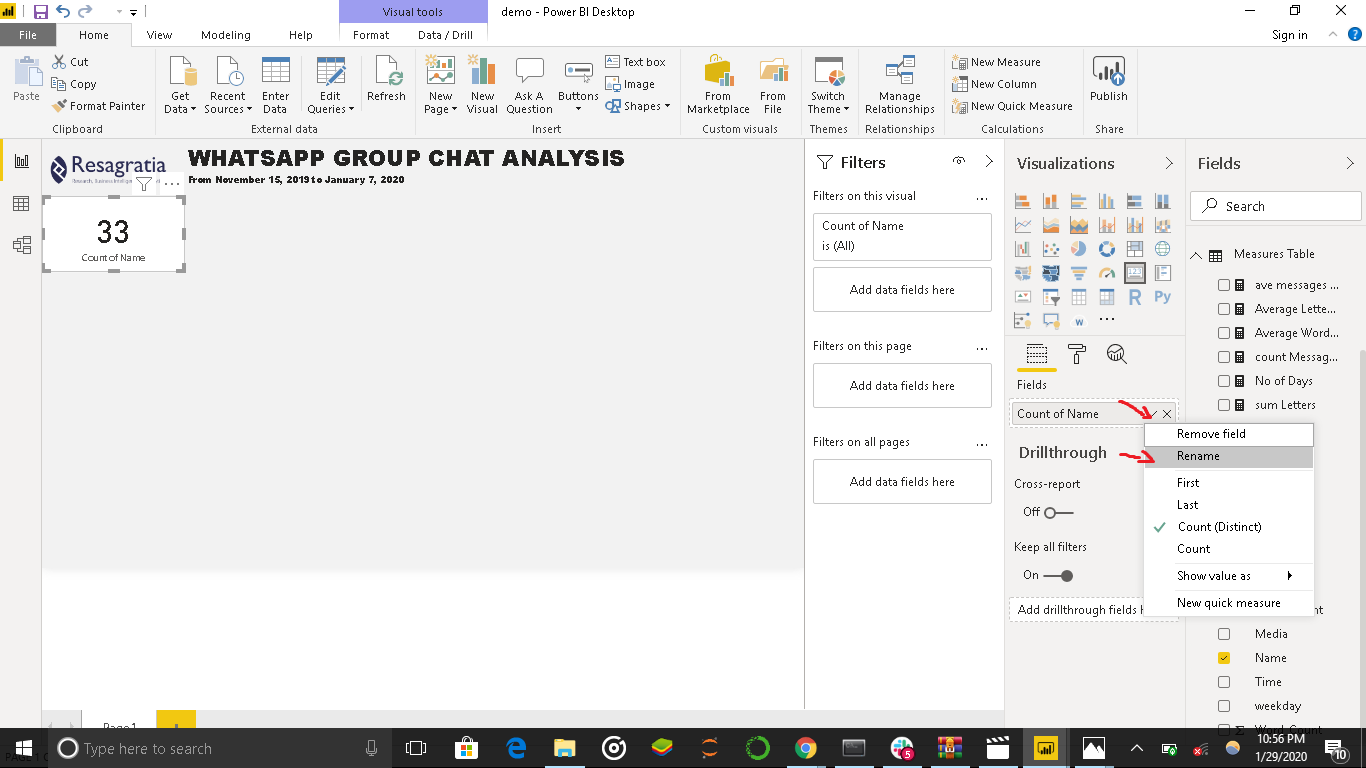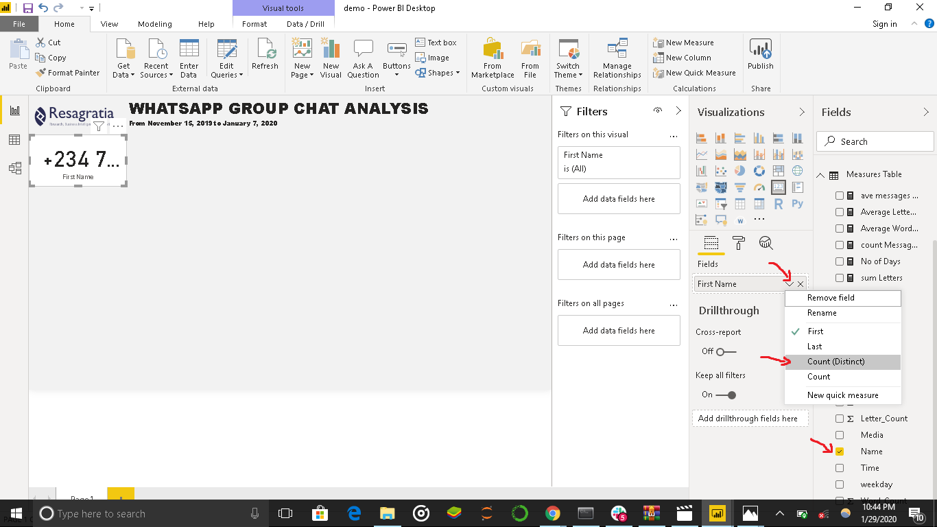 Now navigate to the WhatsappChat table and select Name. On the Visualization pane under the Fields icon, click the drop-down next to First Name and select Count (Distinct).