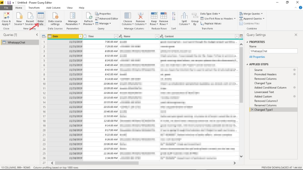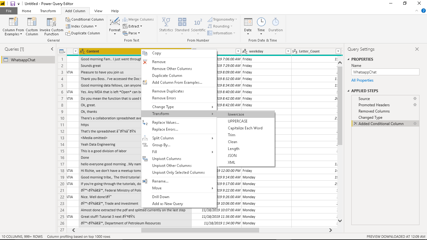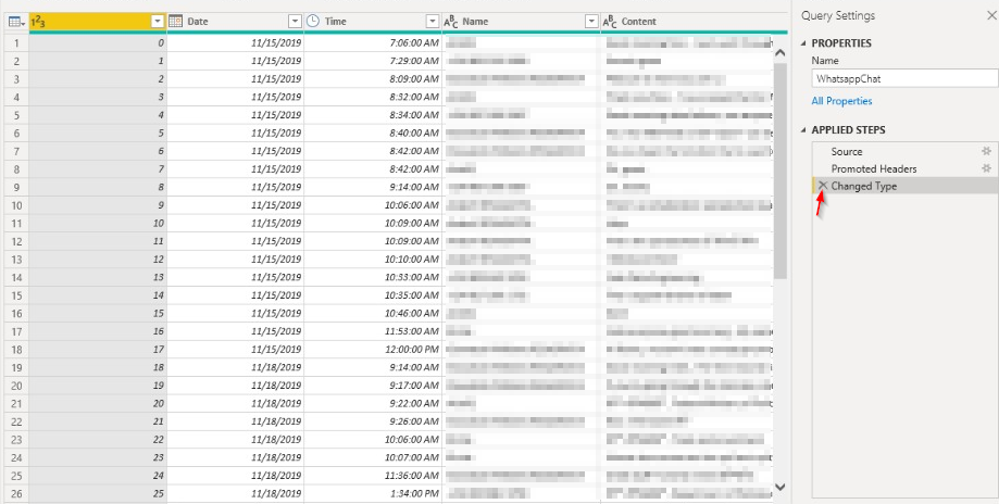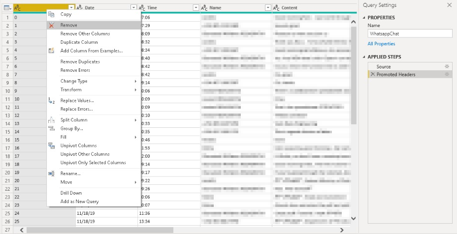 Navigate to your project folder where you saved the “WhatsappChat.csv” file and select it. You should see a table containing our data. Click on Transform Data. This will transfer our data directly to the Power Query editor where we can perform some data transformations.