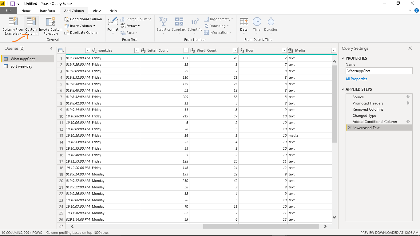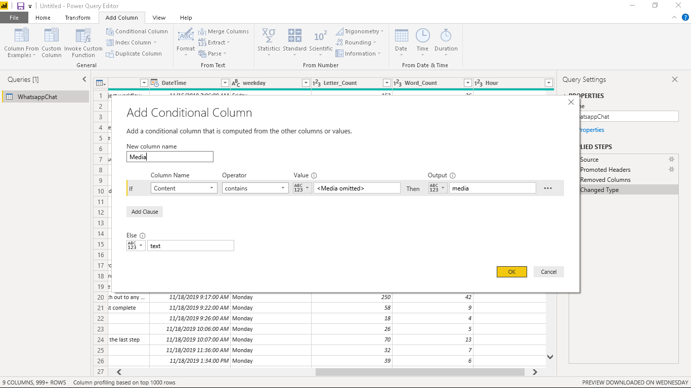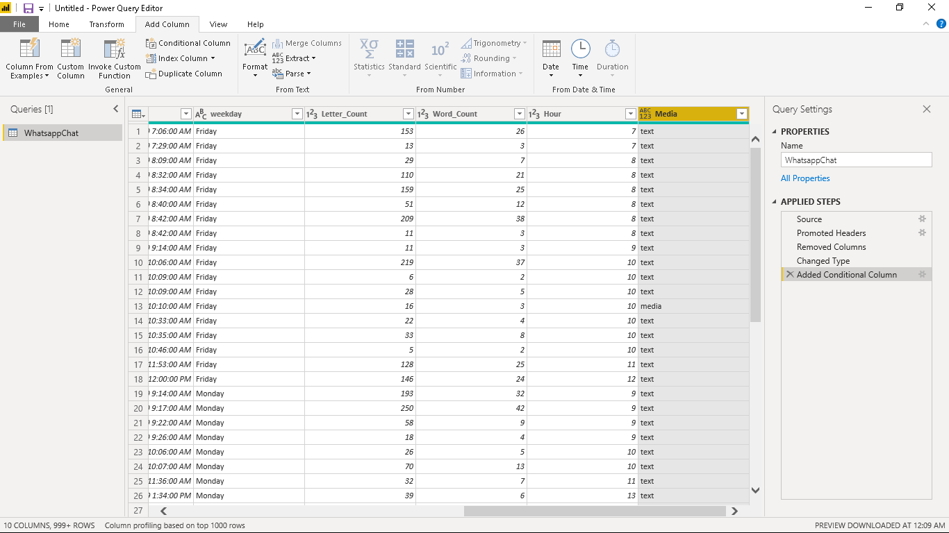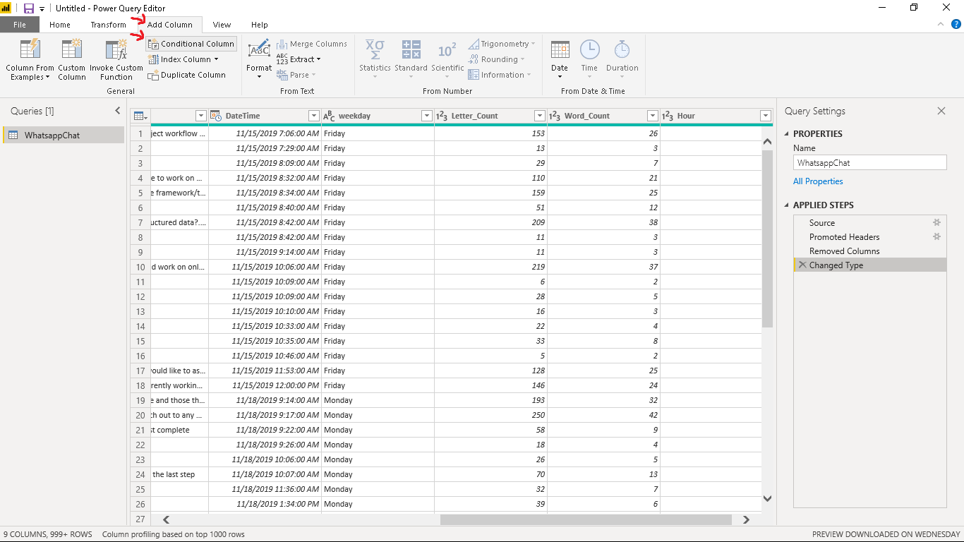 We will create a new column named “Media” showing message type as either “media” or “text”. Navigate to the Add Column tab and click on Conditional Column.