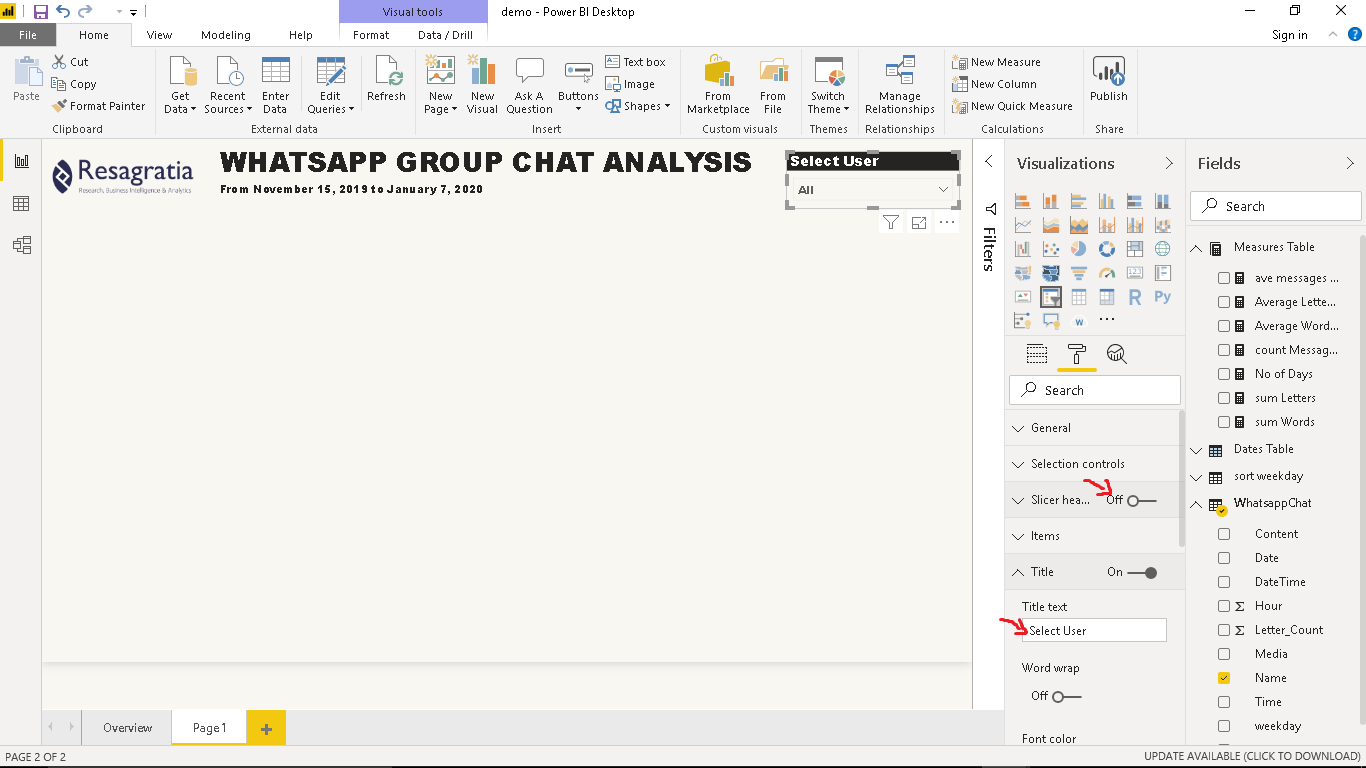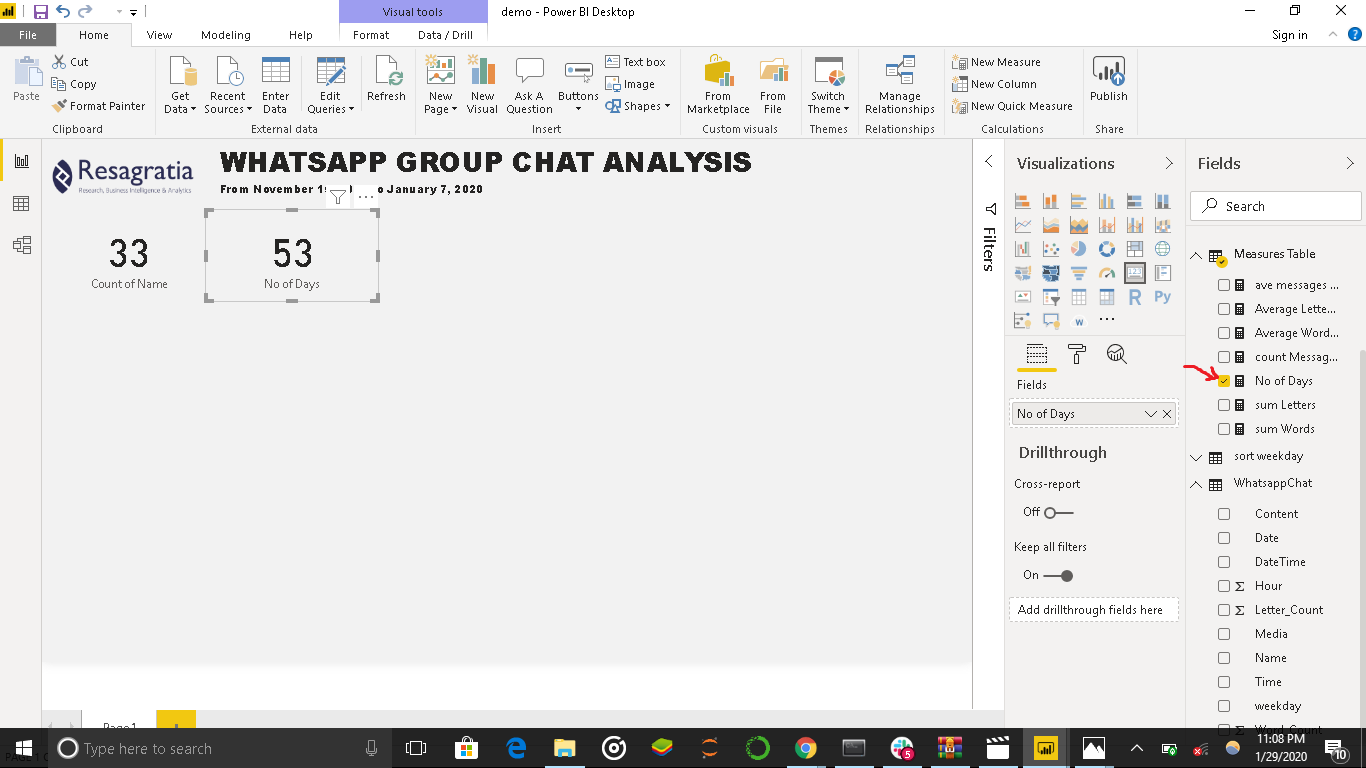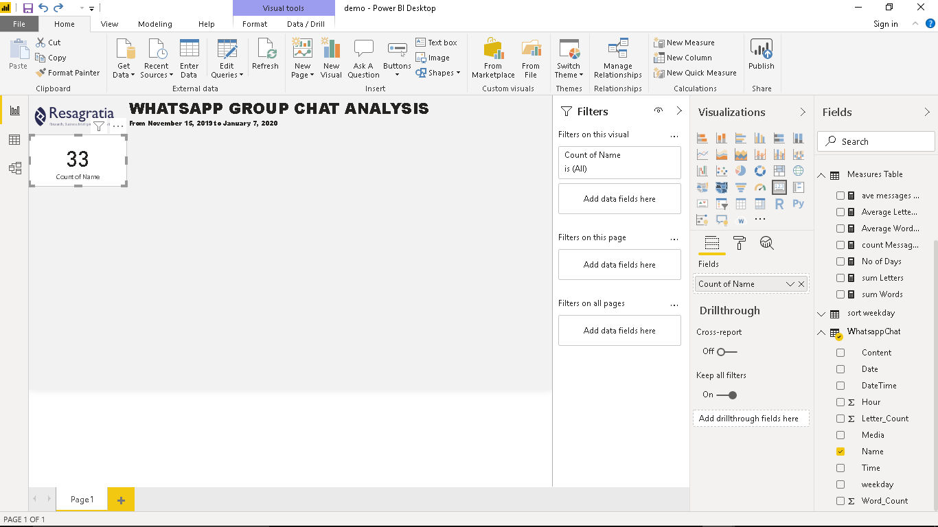 In the first part of this tutorial, we exported our Whatsapp chat data, cleaned and transformed it into a dataframe and saved our cleaned data in CSV format. Now we will import this CSV file in Power BI and derive insights by creating awesome visuals.