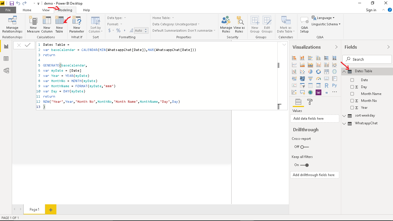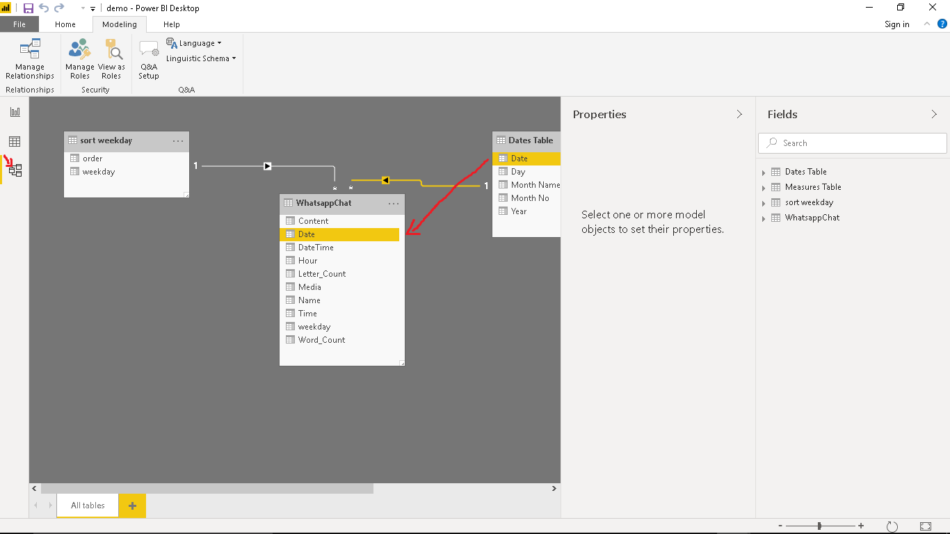Navigate to Model and create a relationship between WhatsappChat Table and Dates Table by dragging Date in the Dates Table and dropping it on Date in the WhatsappChat Table.