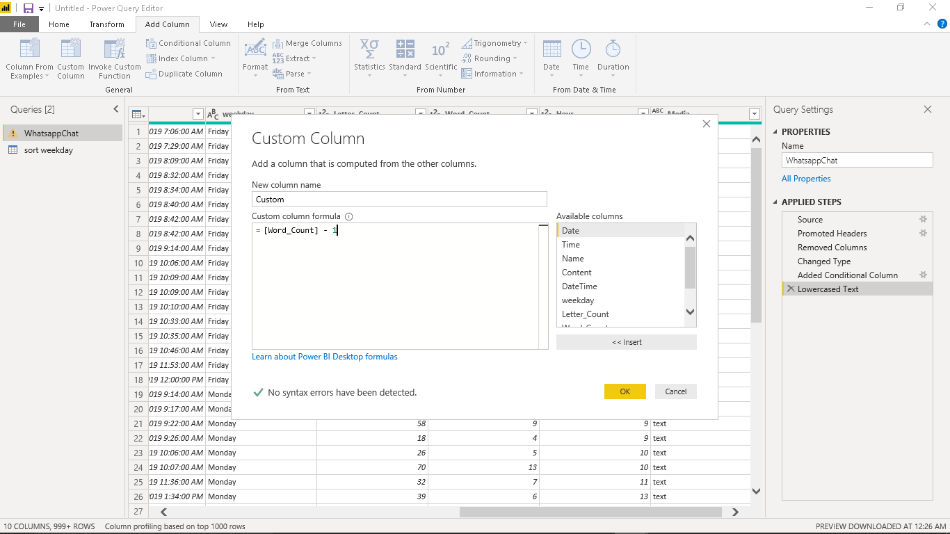 Right-click and remove the Word_Count column then rename the newly created column from Custom to Word_Count. Change the type to “Whole Number“.