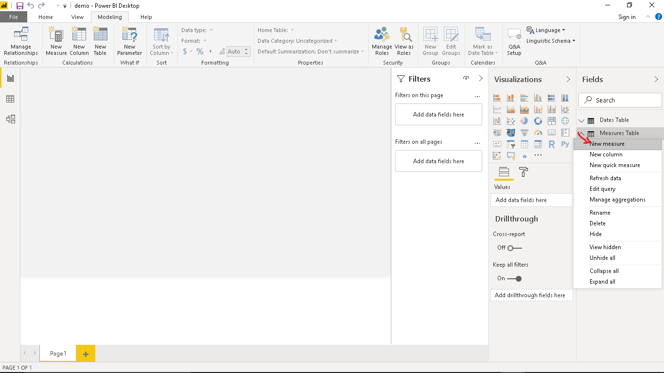 Now we can add Measures to the Measures Table. Right-click on the Measures Table and select New measure.