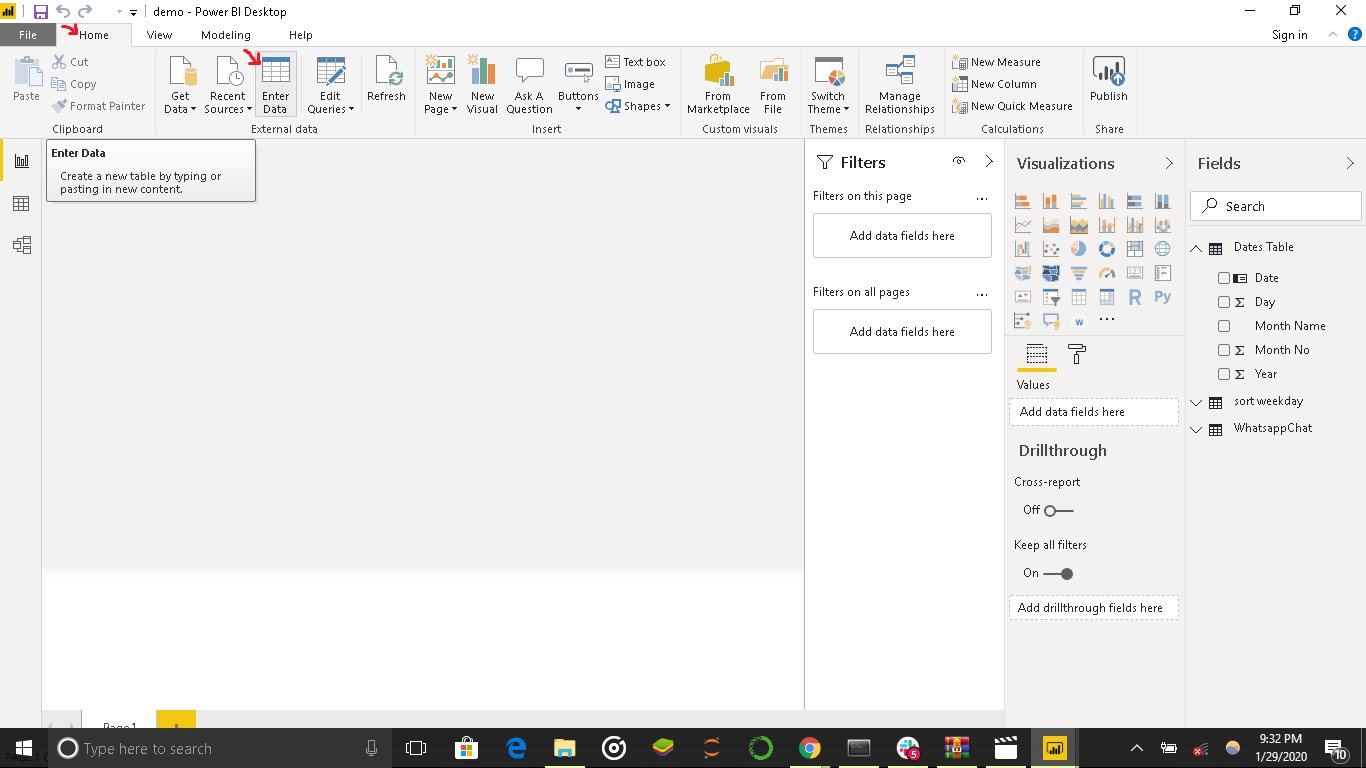 Next, we will create a Measures table. Measures are calculations used in Data Analysis. Navigate to Home tab and select Enter Data: