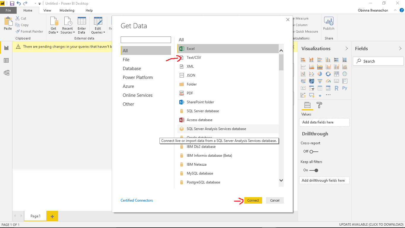First, we import the CSV file we created from the first tutorial. Click on the Get Data icon, select Text/CSV and click connect