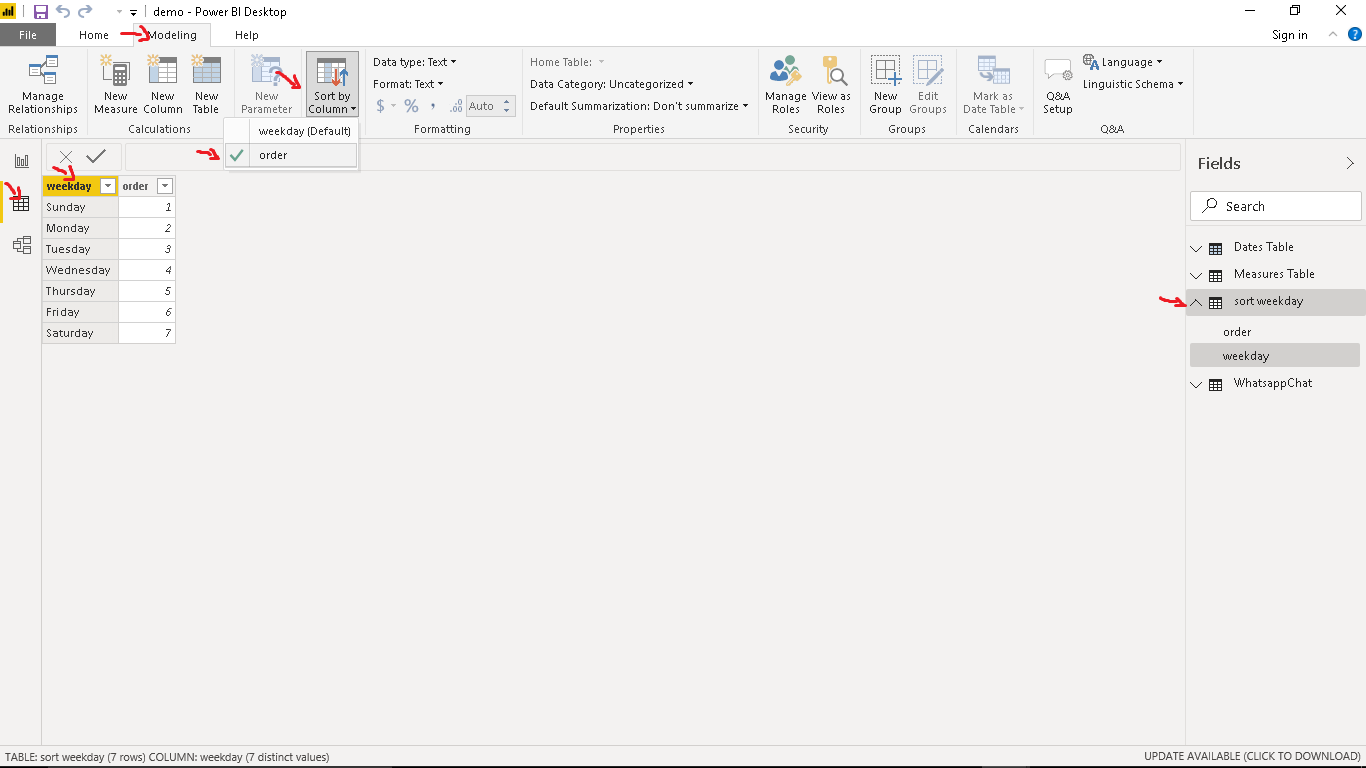 Lastly, we will insert a Stacked column chart visual showing Most Active Day of Week by Total Messages. Go to the Data view and select the sort weekday table. Click on the weekday column, now click the Sort by Column option on the window above and select order. This ensures our visual is arranged in order starting from Sunday and ending on Saturday.