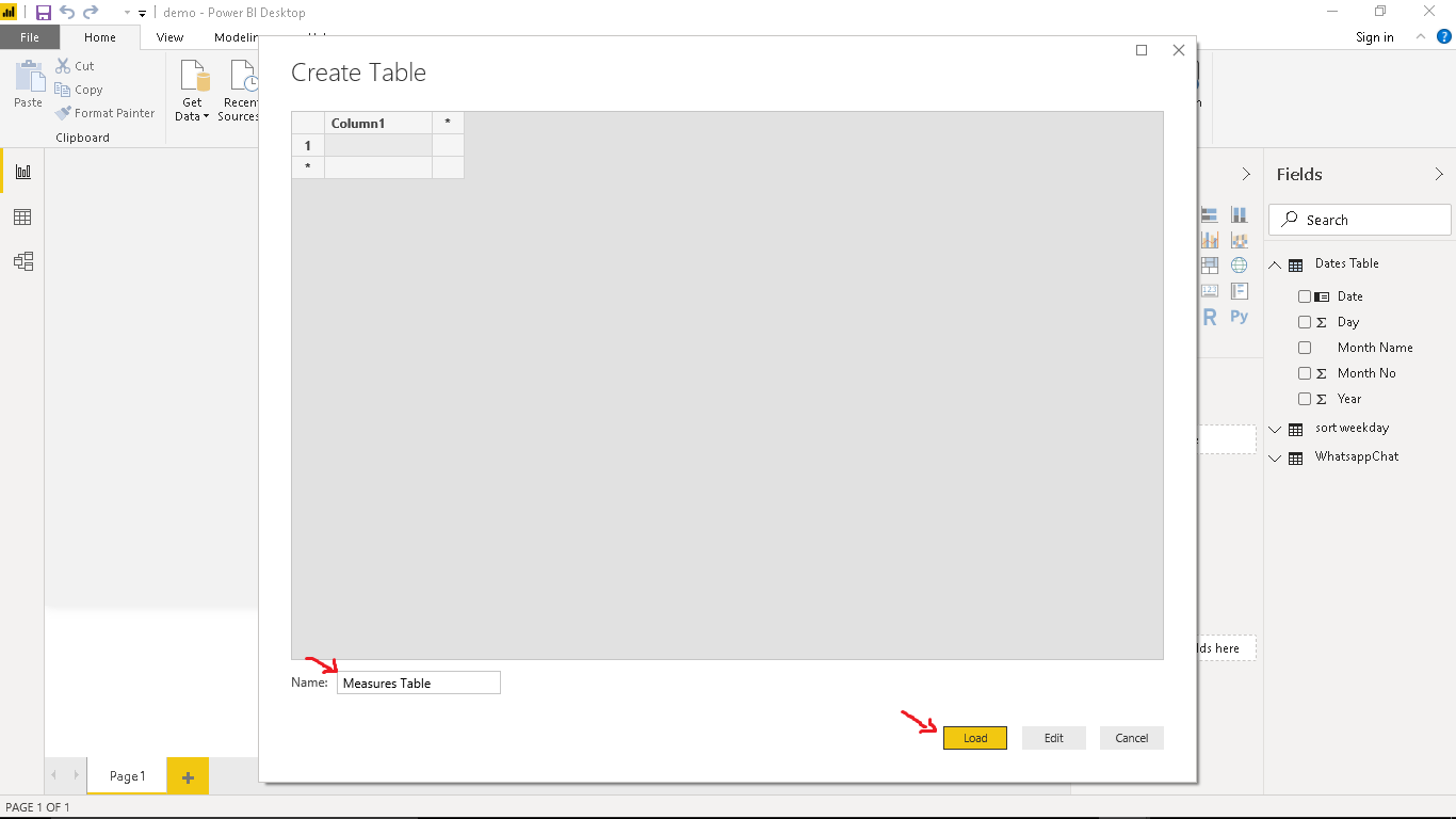Rename the table to Measures Table and select Load.