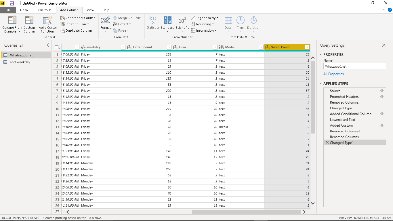 Do the same for the other columns. Select Time for the Time column, Text for the Name, Content and weekday columns, Date/Time for the DateTime column and Whole Number for the Letter_Count, Word_Count and Hour columns.