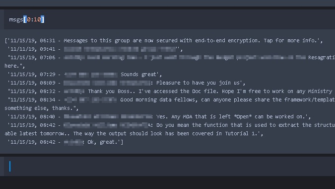 Next, we will group all the lines in clean_chat into messages and store in a variable named msgs. Every message begins with a date e.g 12/12/19 and we will use this property in grouping. We will make use of the regex package in Python by running the code below: