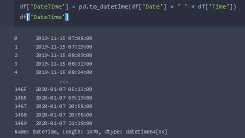 We will create additional columns by taking advantage of built-in functions in pandas. First, let us create a Datetime column by merging Date and Time columns and using the pd.to_datetime function: