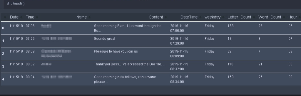 Now we can finally use the pandas library to merge our date, time, name and content data into a Dataframe named df using the code below: