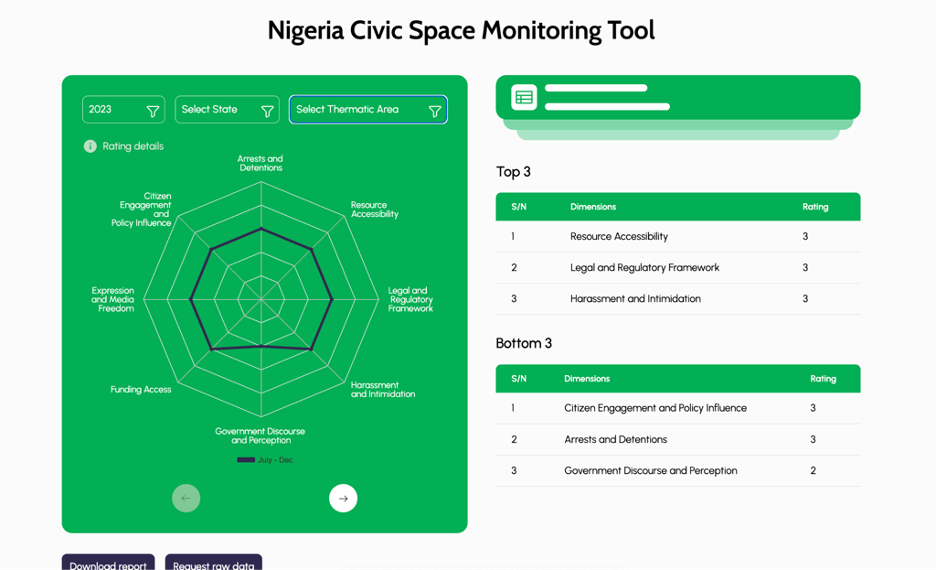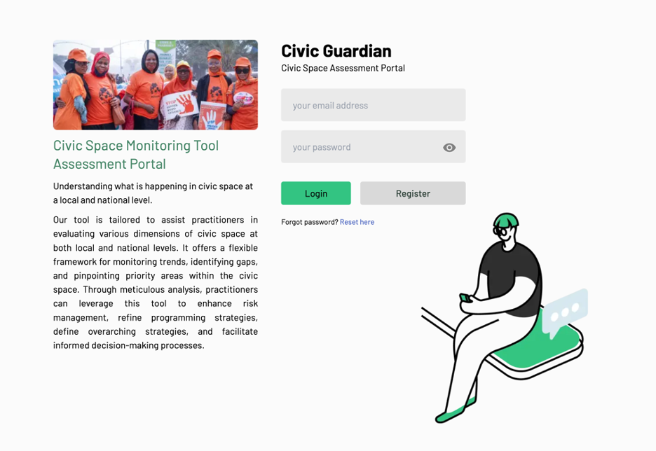 We designed a web application that assists civic space practitioners in evaluating various dimensions of the civic space at both local and national levels. The tool offers a flexible framework for monitoring trends, identifying gaps, and pinpointing priority areas within the civic space.