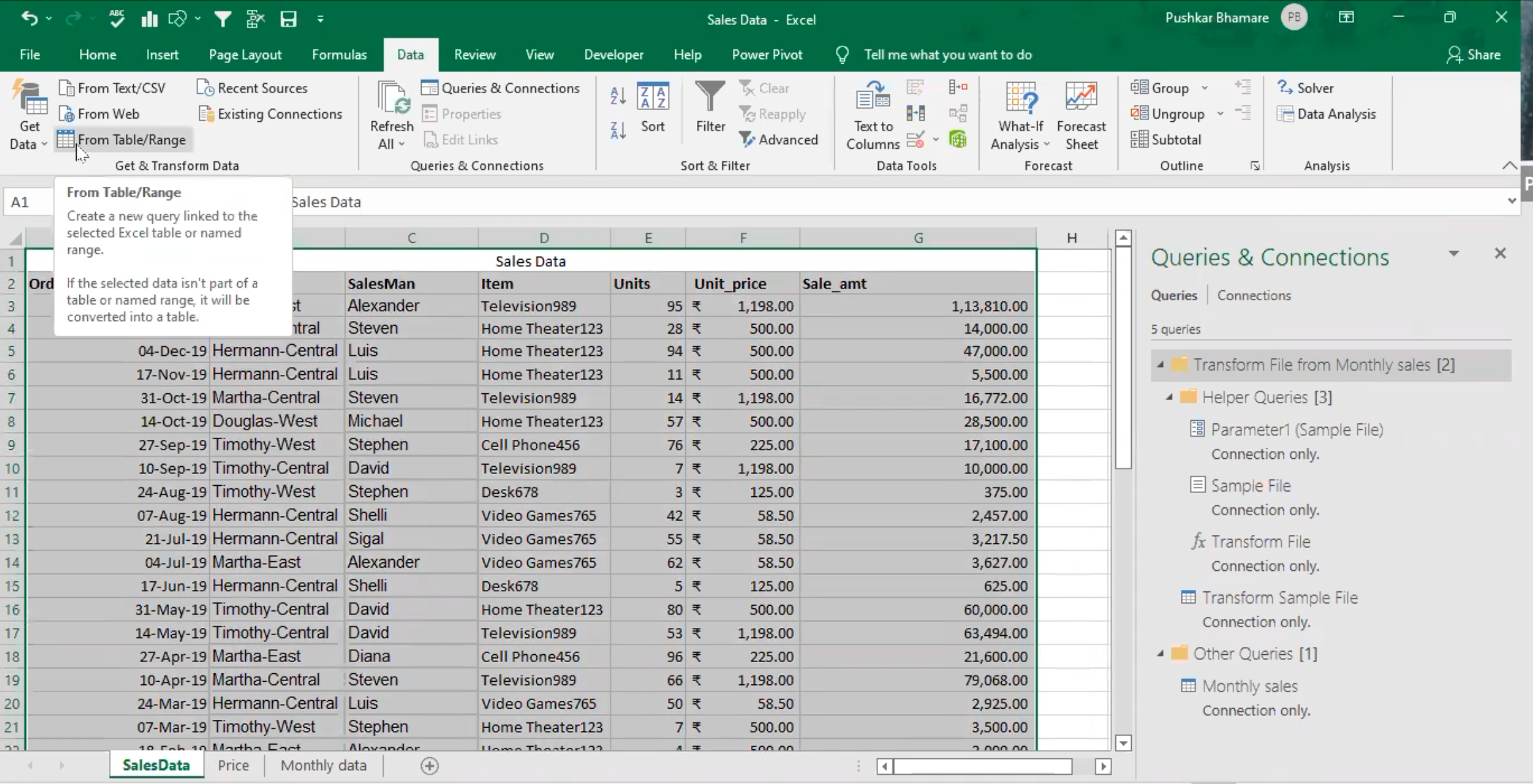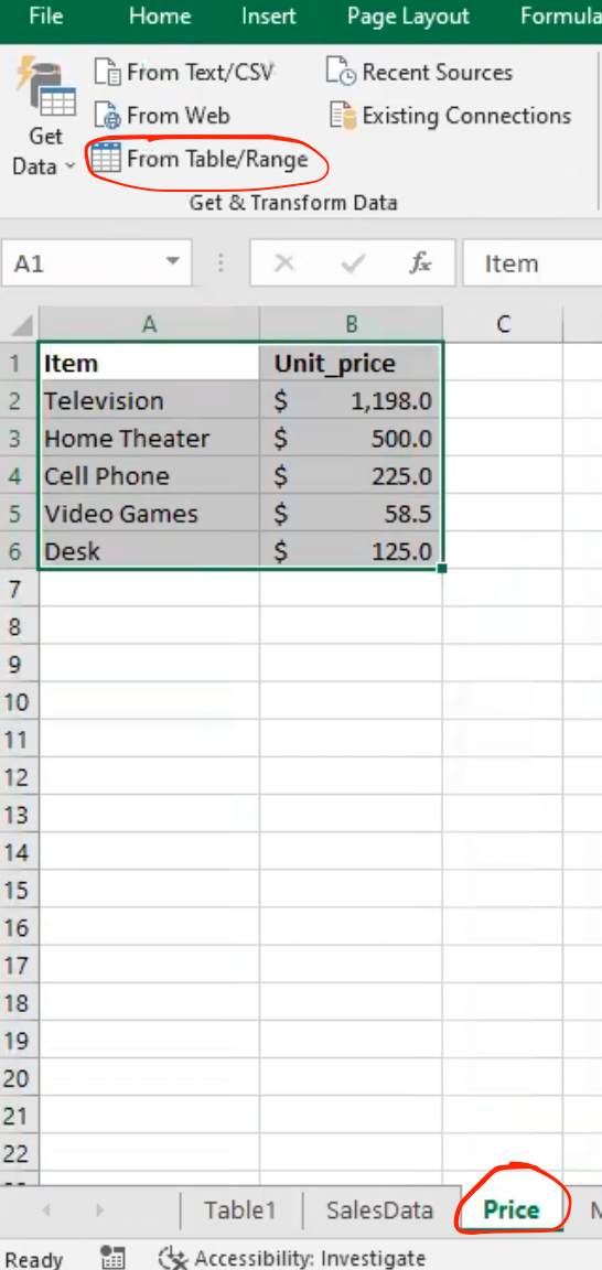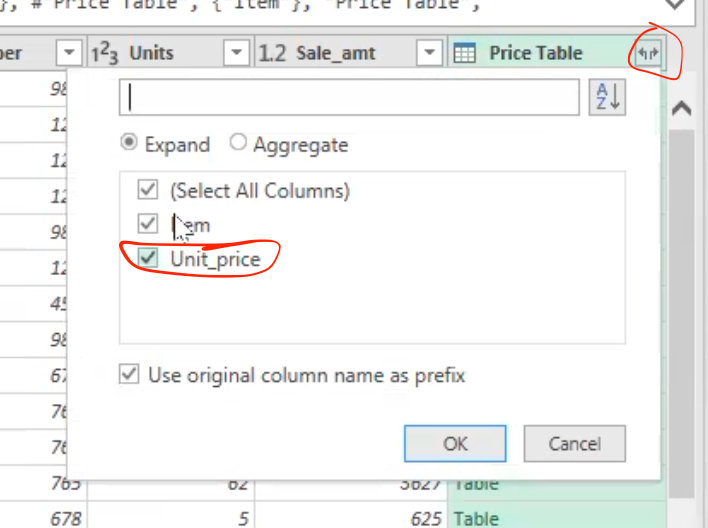 Note: Rename the combined table in power query to be “data table” and load the “price table” from excel into the power query editor in a bid to get the unit price for each items using the merge query option.