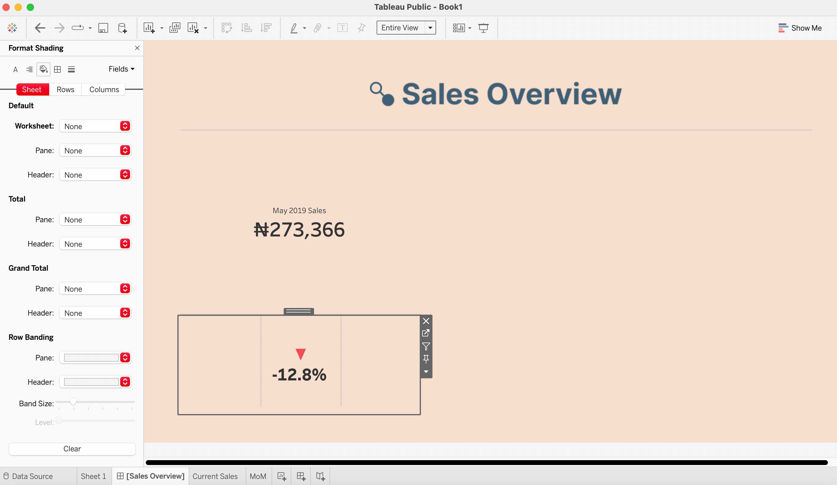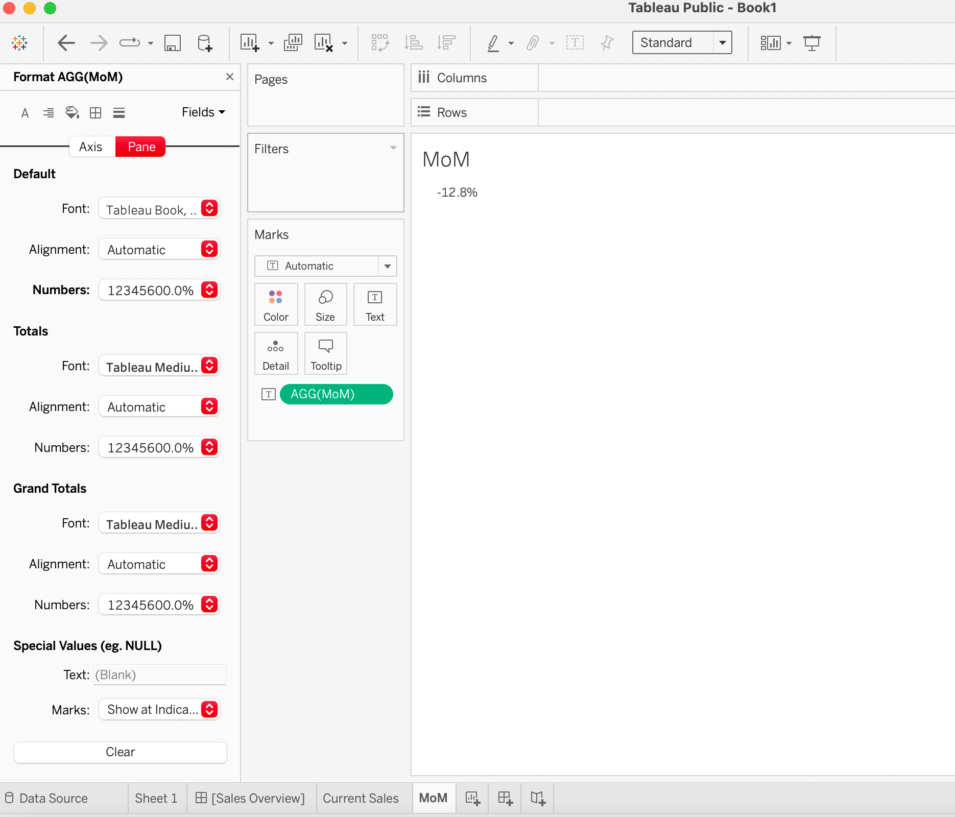 5. Drag the calculated field into a new sheet and rename the sheet as MoM and change to percentage and 1 - decimal place.
