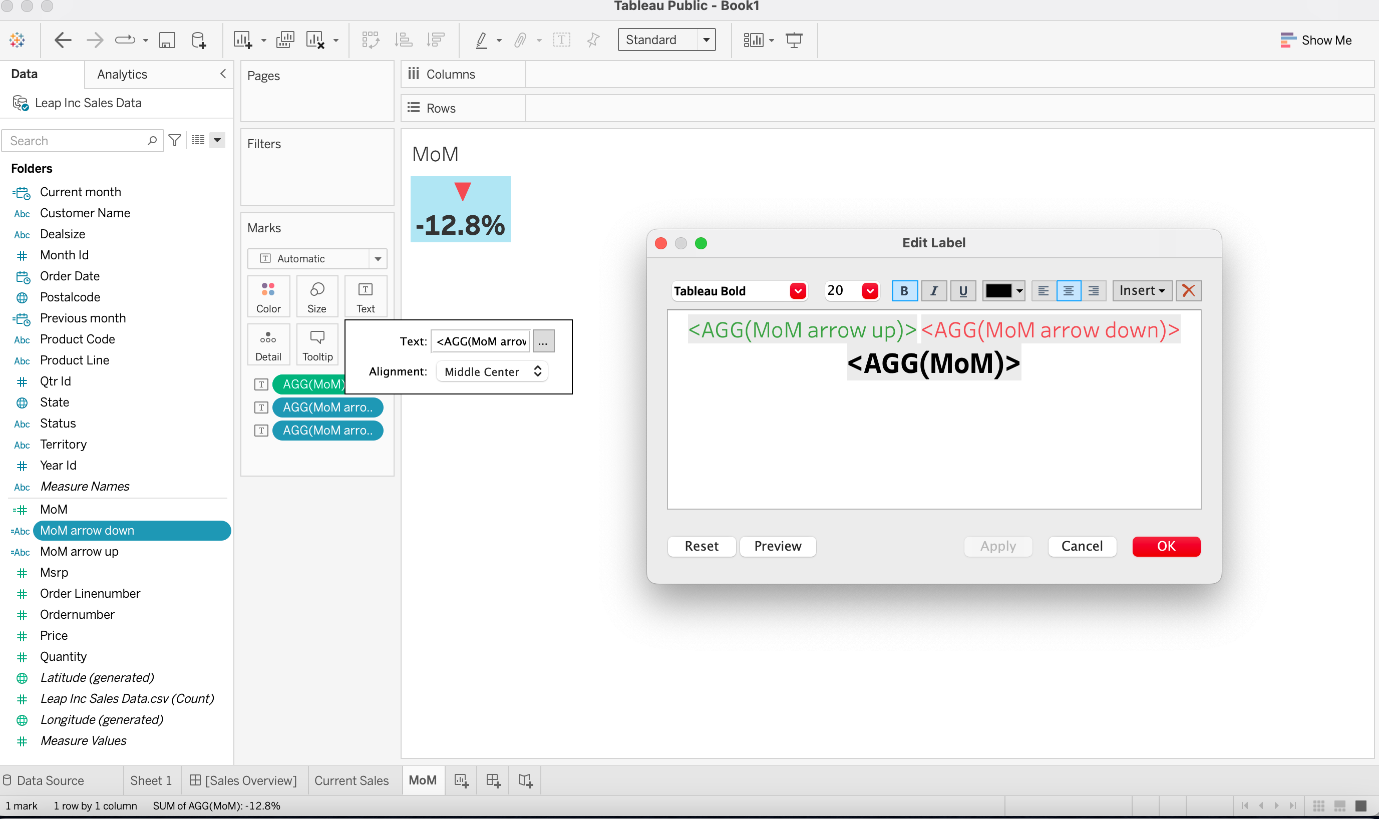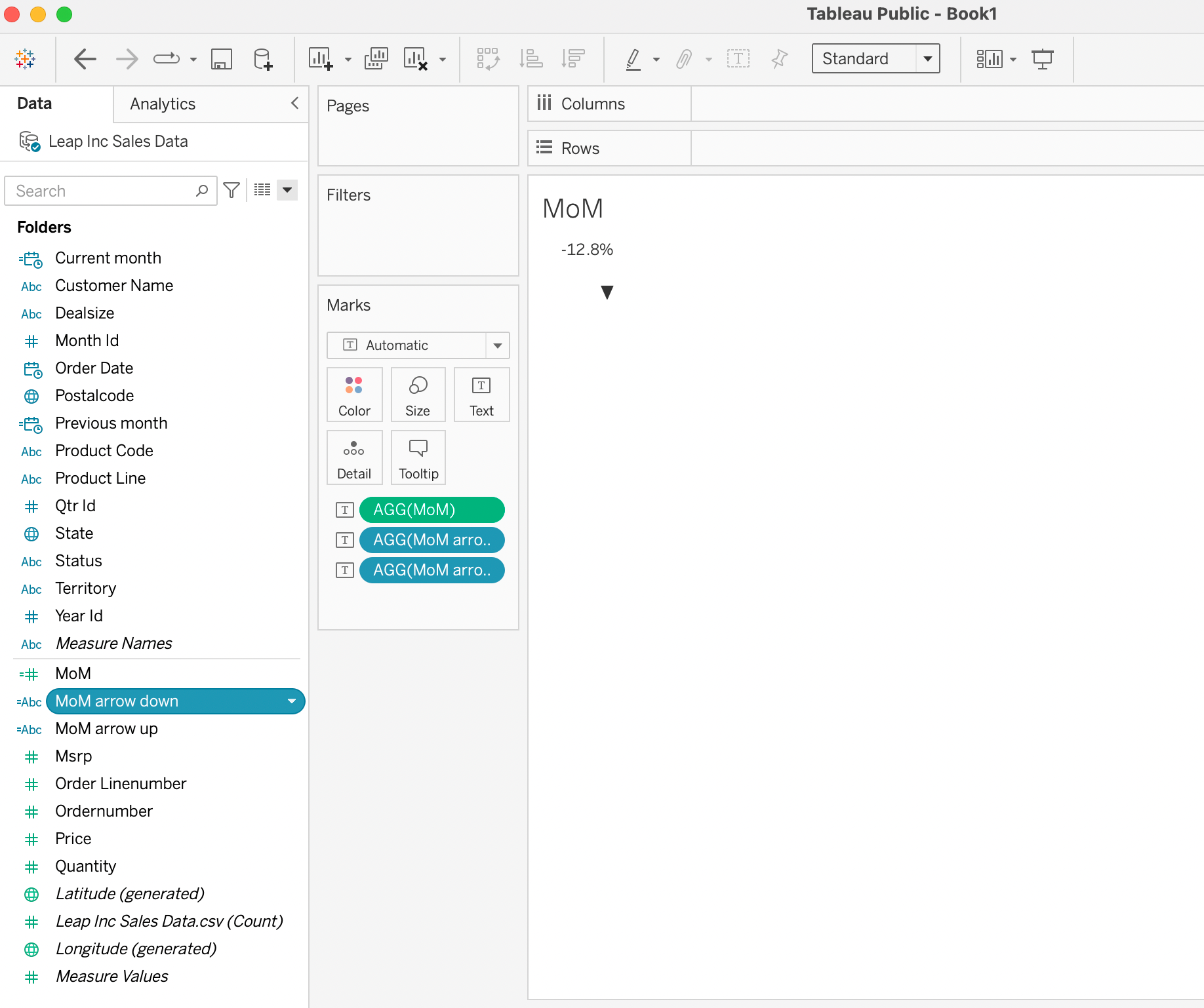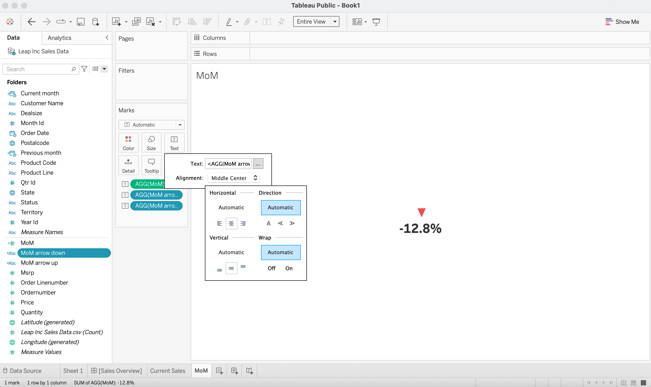 6. Addition of the arrow by creating a calculated field named MoM arrow using the formulae and the unicode notations and drag the field into text to see the display.