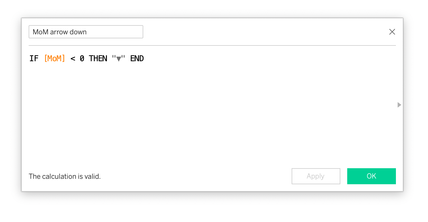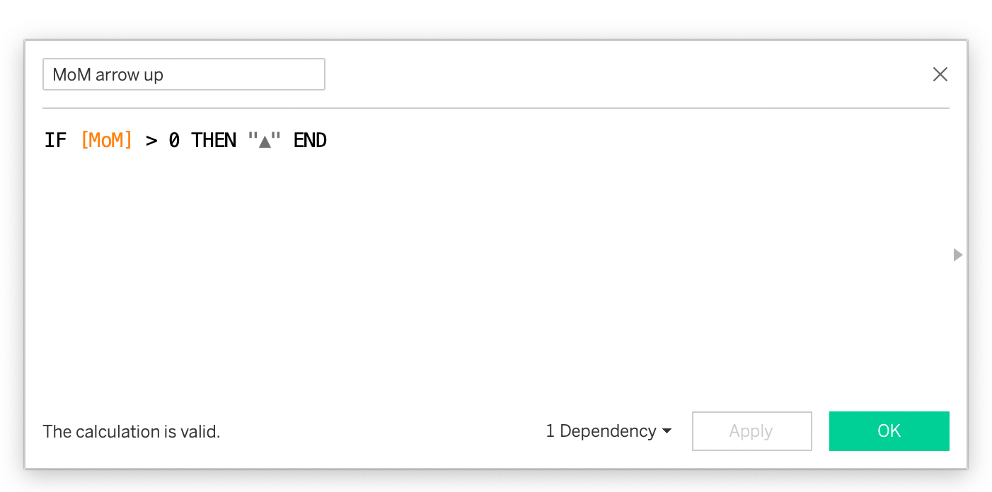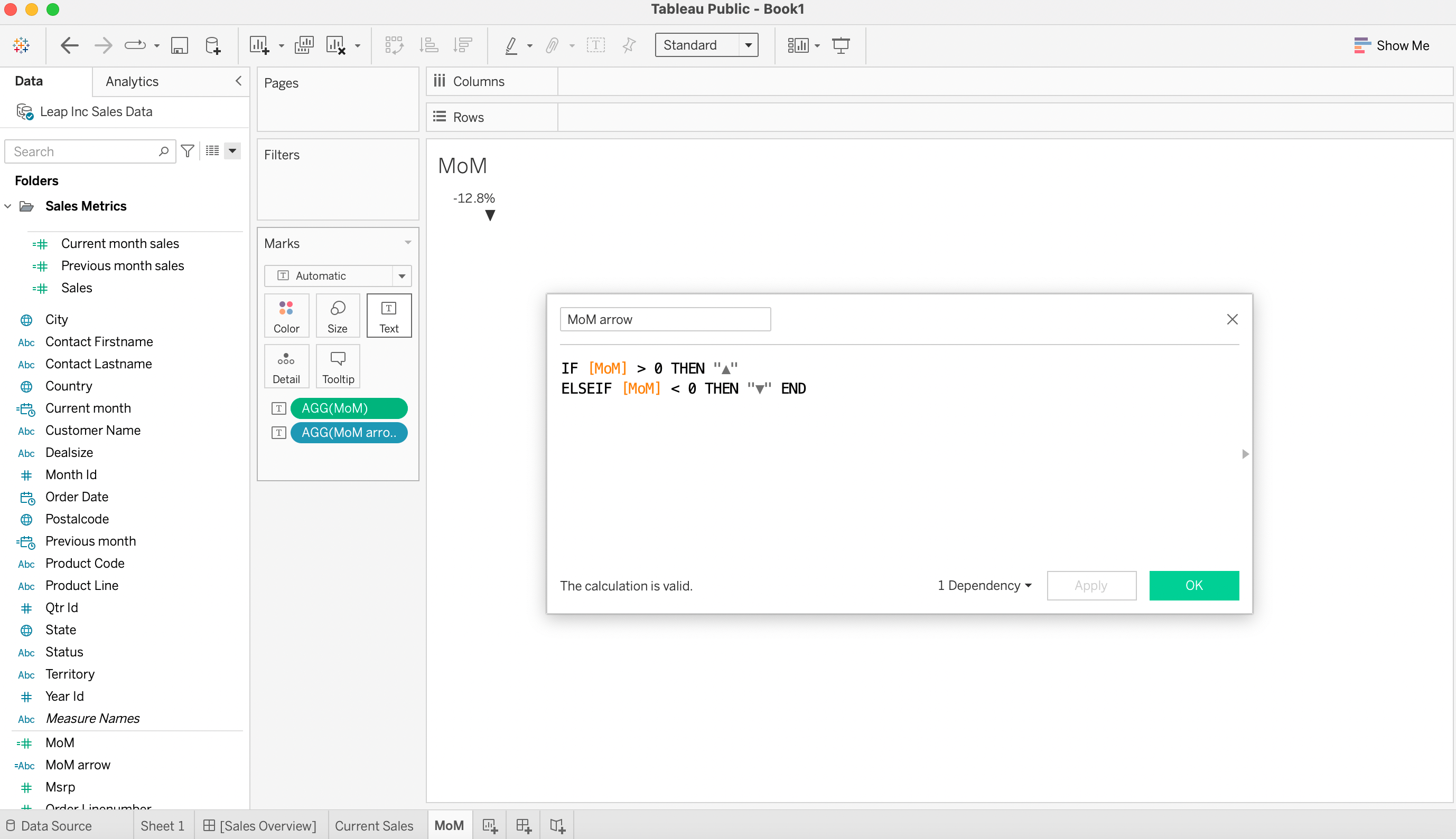 6. Addition of the arrow by creating a calculated field named MoM arrow using the formulae and the unicode notations and drag the field into text to see the display.