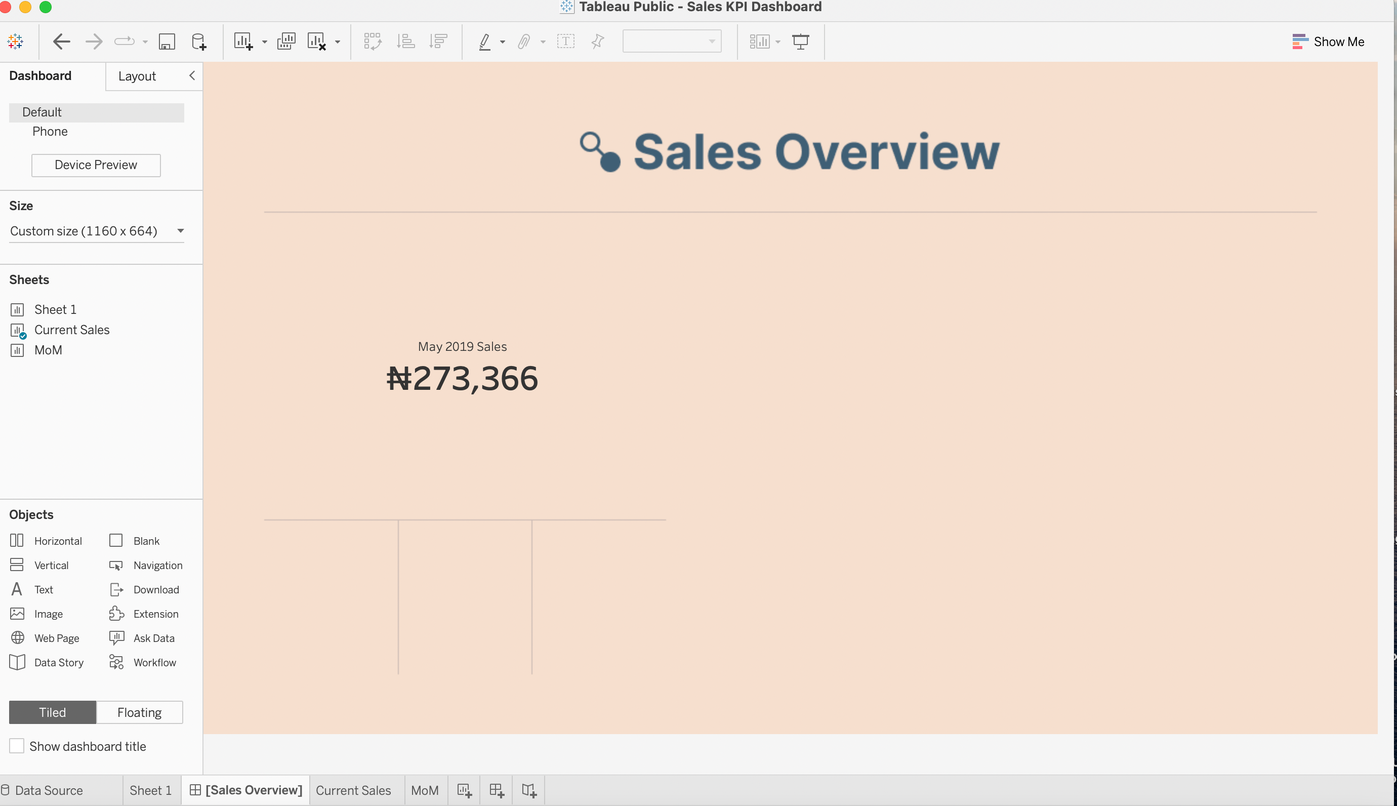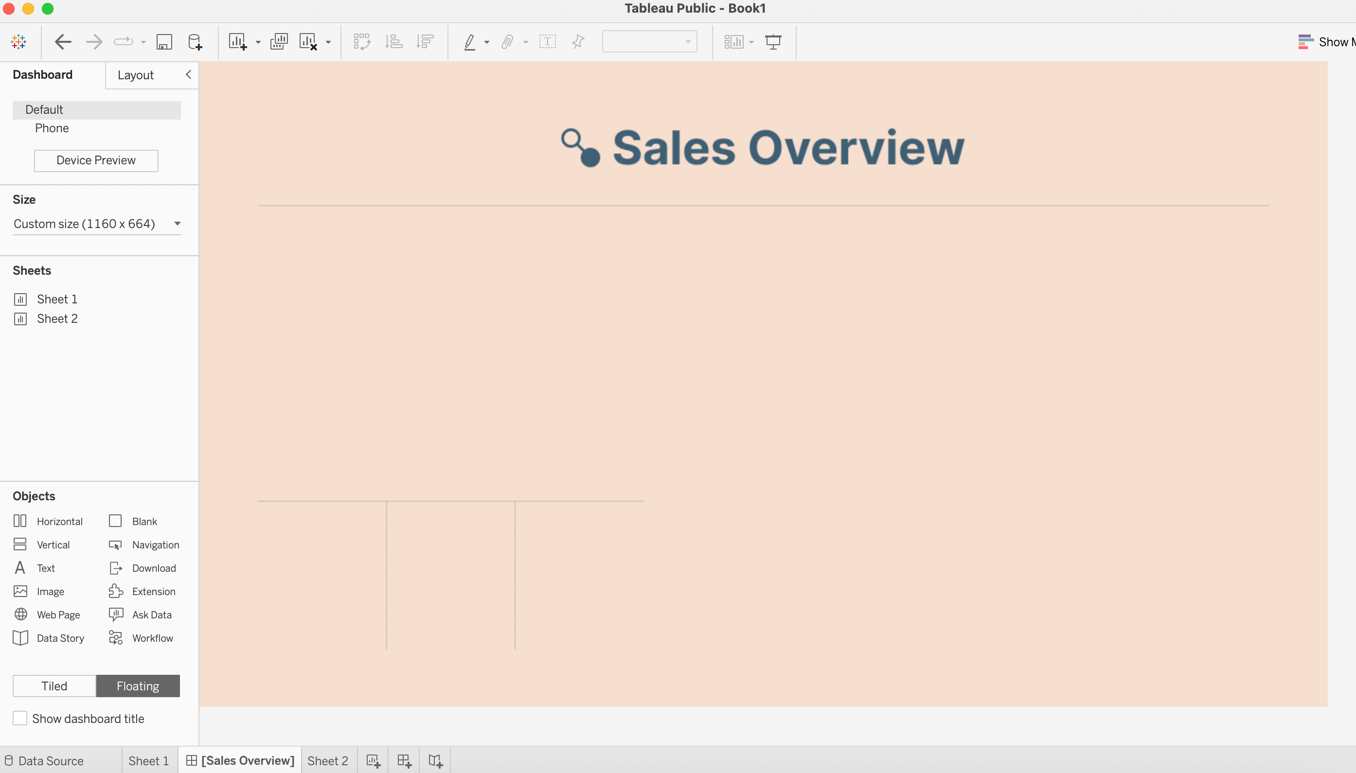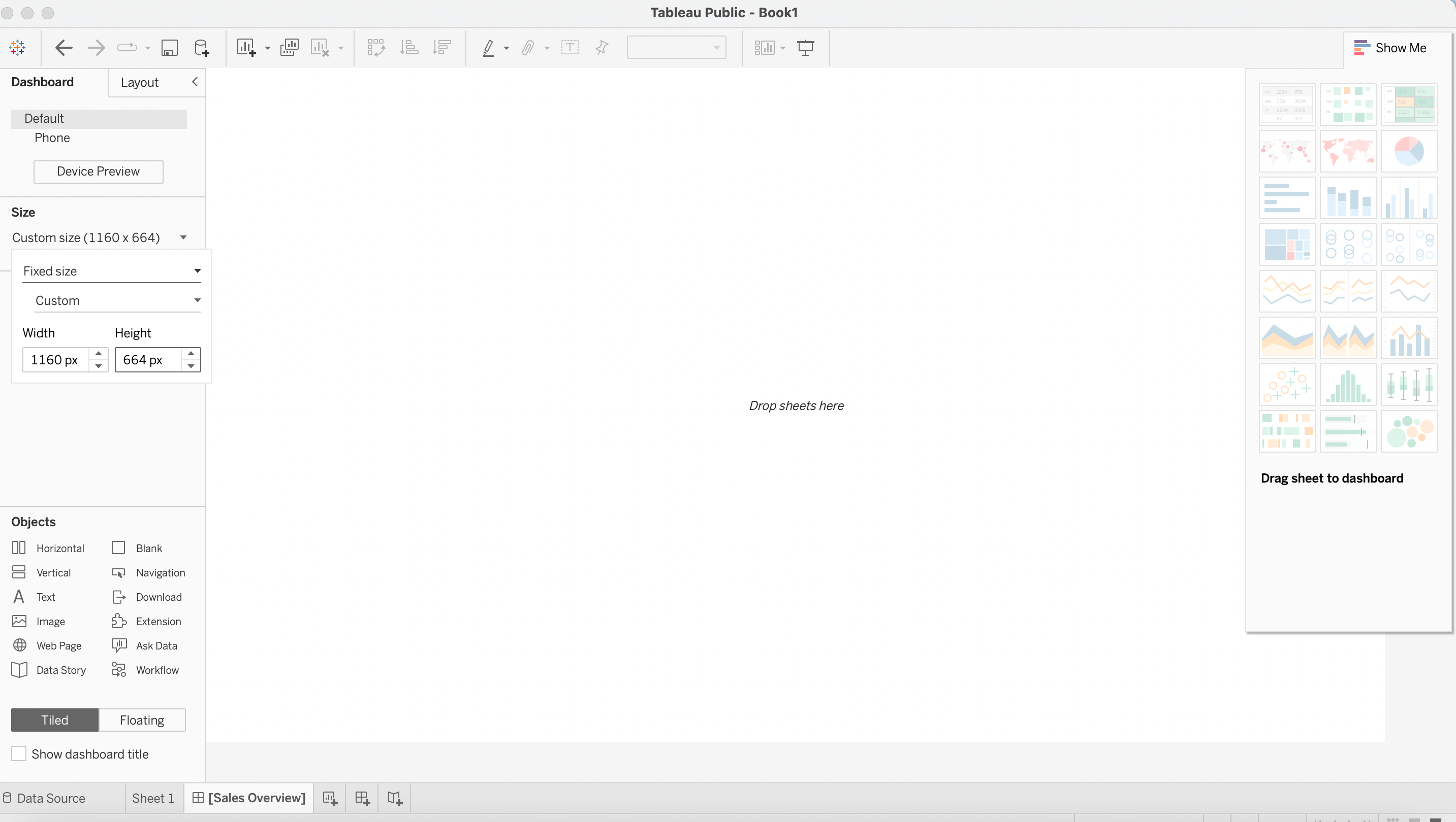 Create dashboard and name it [Sales Overview] and customize the size based on the size of the Figma background created above (1160 by 664 px) to be imported.