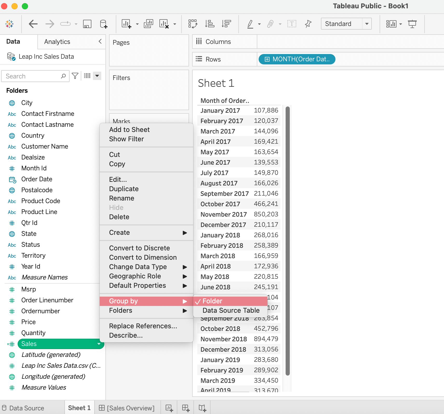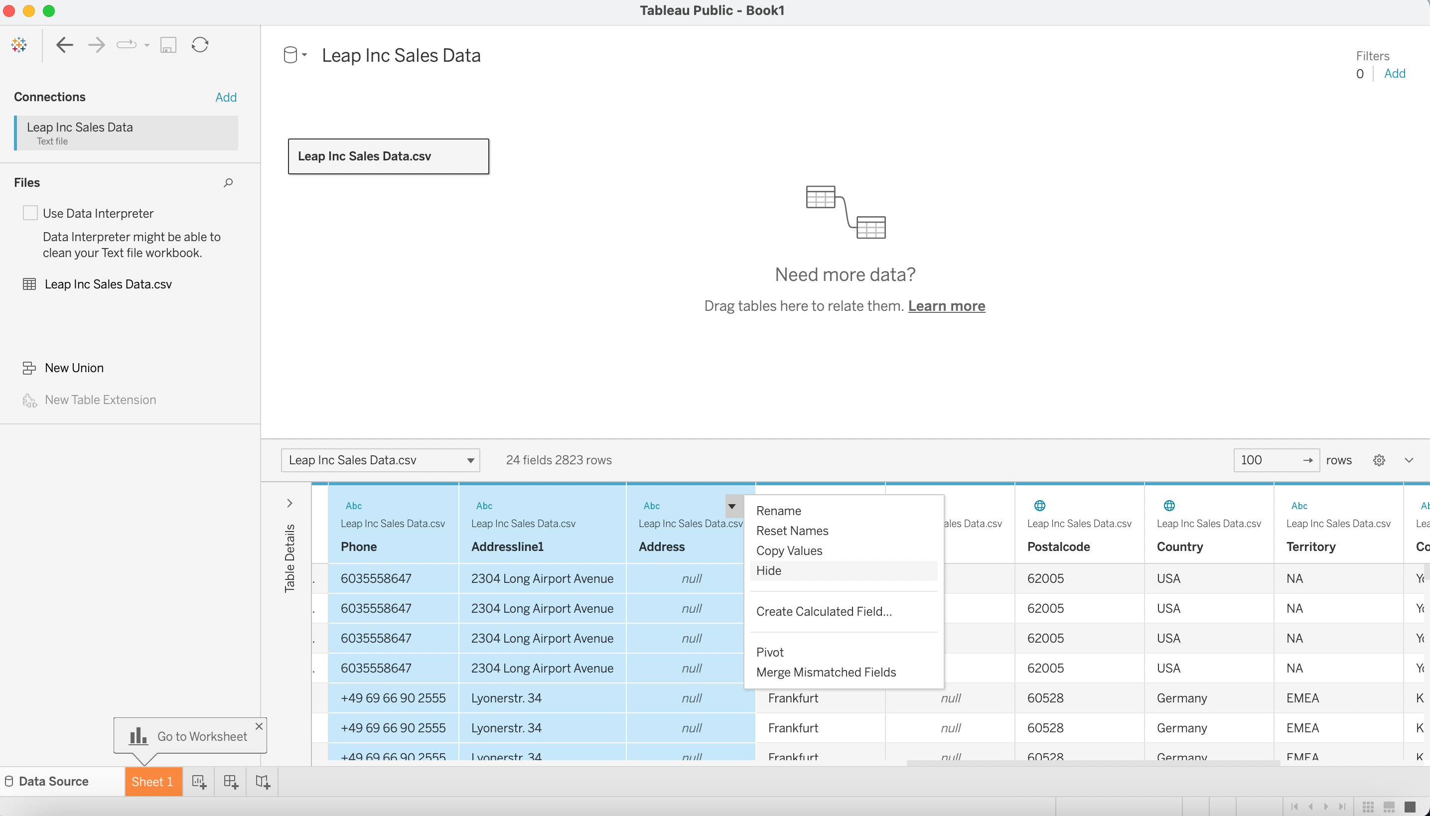 Hide columns that will not be crucial to the analysis and visualization process. Some of this columns includes Phone, Addressline, Address and any other features that will not be necessary for the project. This helps to optimize the processing speed of your models in Tableau. After hiding this features, then move to the worksheet 1 to start the analysis and visualization proper