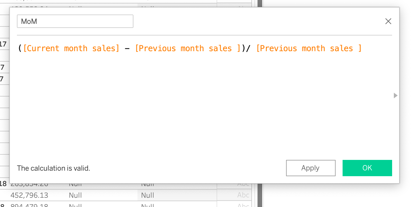 4. The create a calculated field for MoM (Month on Month Sales) using the formulae below