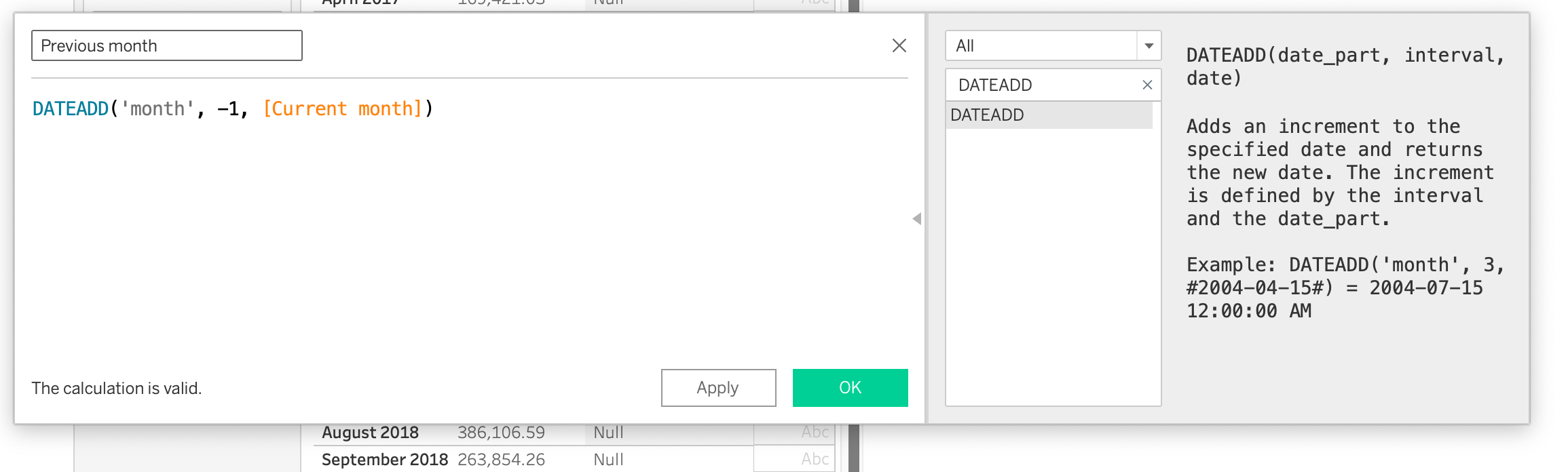 1. Create a calculated field to get the previous month using the formulae below. This is simply like subtracting 1 month from the current month.